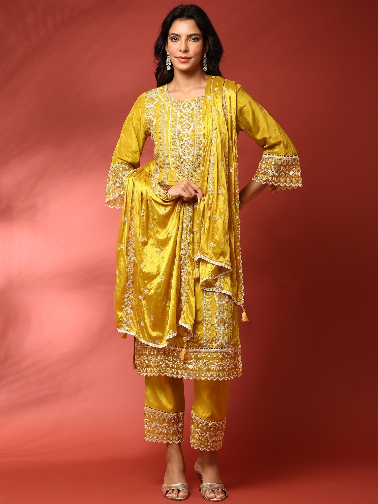This green muslin three-piece suit set features intricate heavy embroidery, combining traditional craftsmanship with elegant design. Crafted from breathable muslin fabric, it ensures comfort for extended wear while showcasing detailed embellishments that add a rich, sophisticated look. Ideal for festive occasions and formal gatherings, this set offers a harmonious balance of style and comfort.