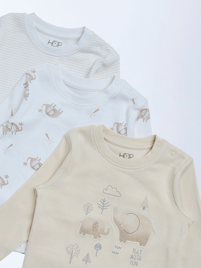 HOP Baby Boys Beige Printed Cotton T-Shirts - Pack of 3