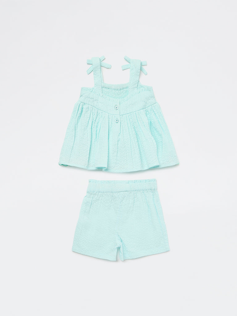HOP Baby introduces this mint set, bringing a light and breezy appeal. It comes with a sleeveless top styled with bow-detailed shoulder straps and a smocked bodice for a comfortable fit. Palm tree embroidery and scalloped hems add playful detail to the flared silhouette. The matching shorts are designed with an elasticated waistband for ease of wear. Crafted from cotton-rich fabric with a subtle textured finish, this ensemble is ideal for outings and holidays.