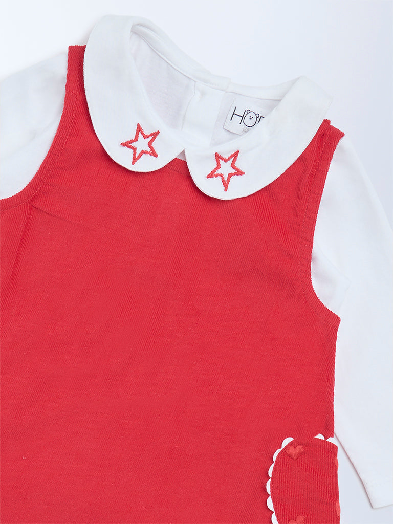 HOP Baby presents a sweet everyday duo. This red pinafore set is woven from a cotton-rich fabric, delivering a soft and gentle feel for all-day wear. The pinafore features heart-shaped pockets with scalloped trims, while the coordinating white t-shirt is styled with long sleeves and an embroidered Peter Pan collar for a polished finish.