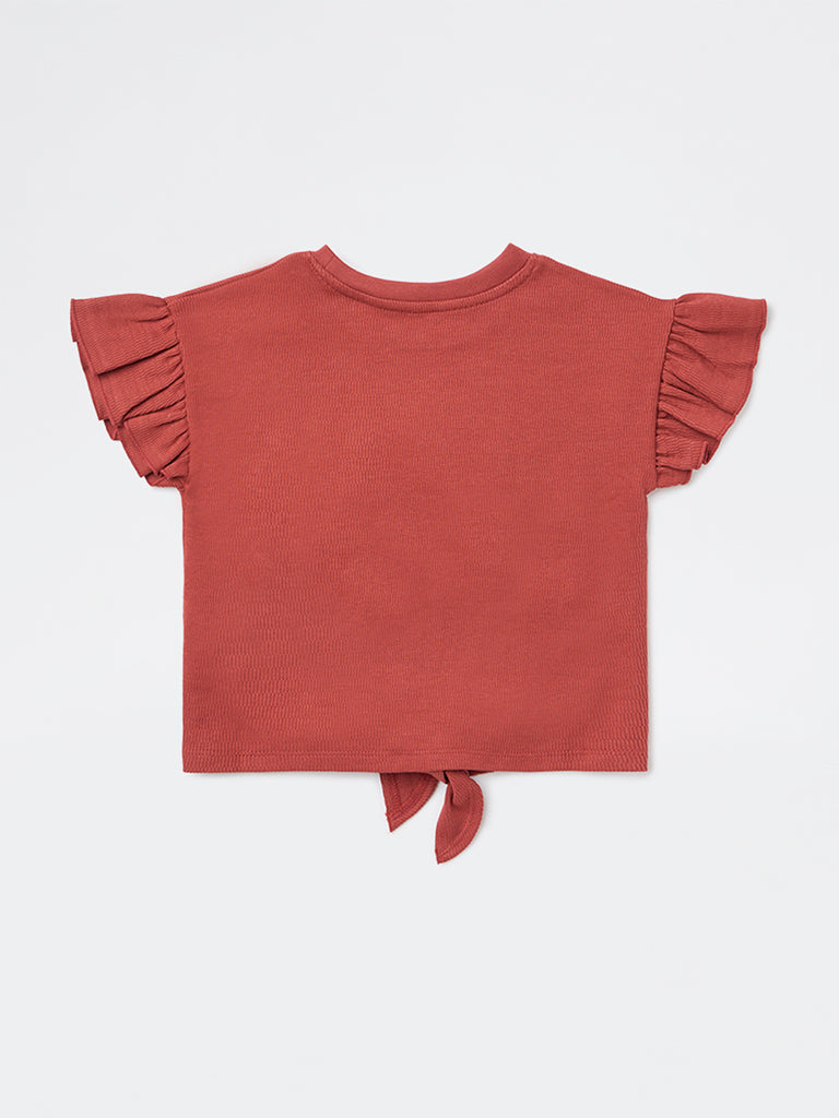 HOP Kids presents this red Top crafted from pure cotton with a soft, textured finish for breathable comfort. Styled with a round neckline and frilly short sleeves, it features delicate embroidered motifs for added detail. A tie-up accent at the centre waistline completes the look, making it a charming pick for stylish everyday dressing.