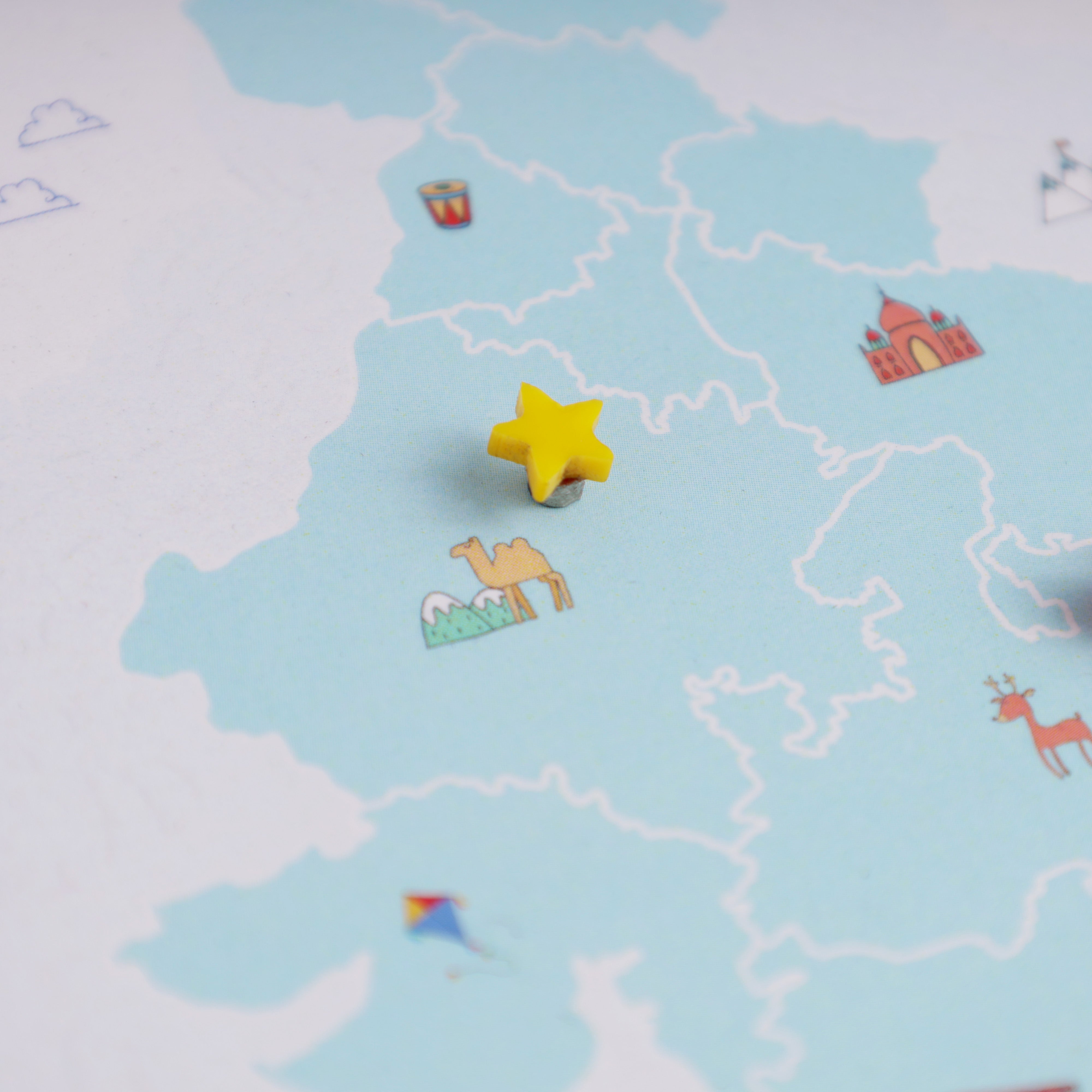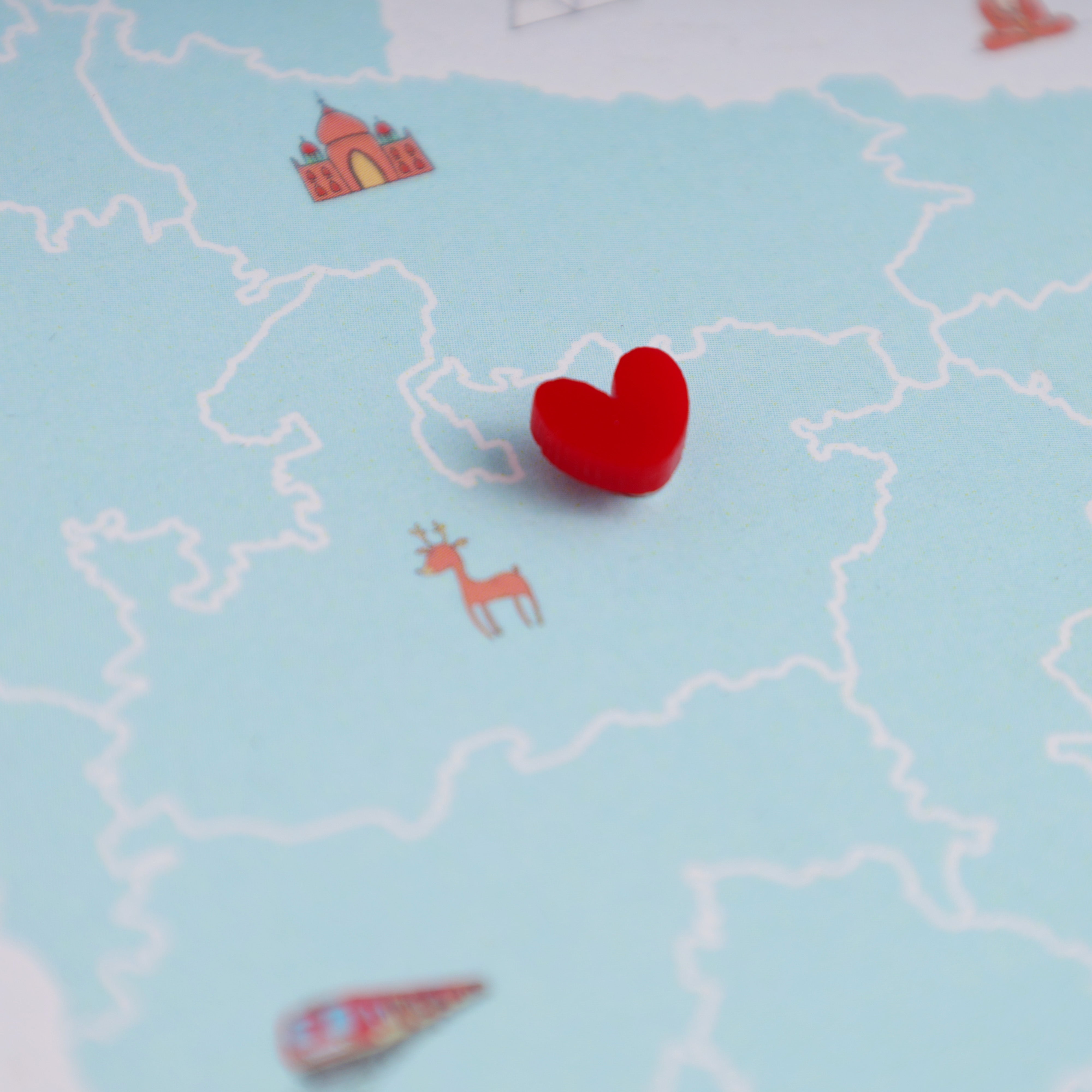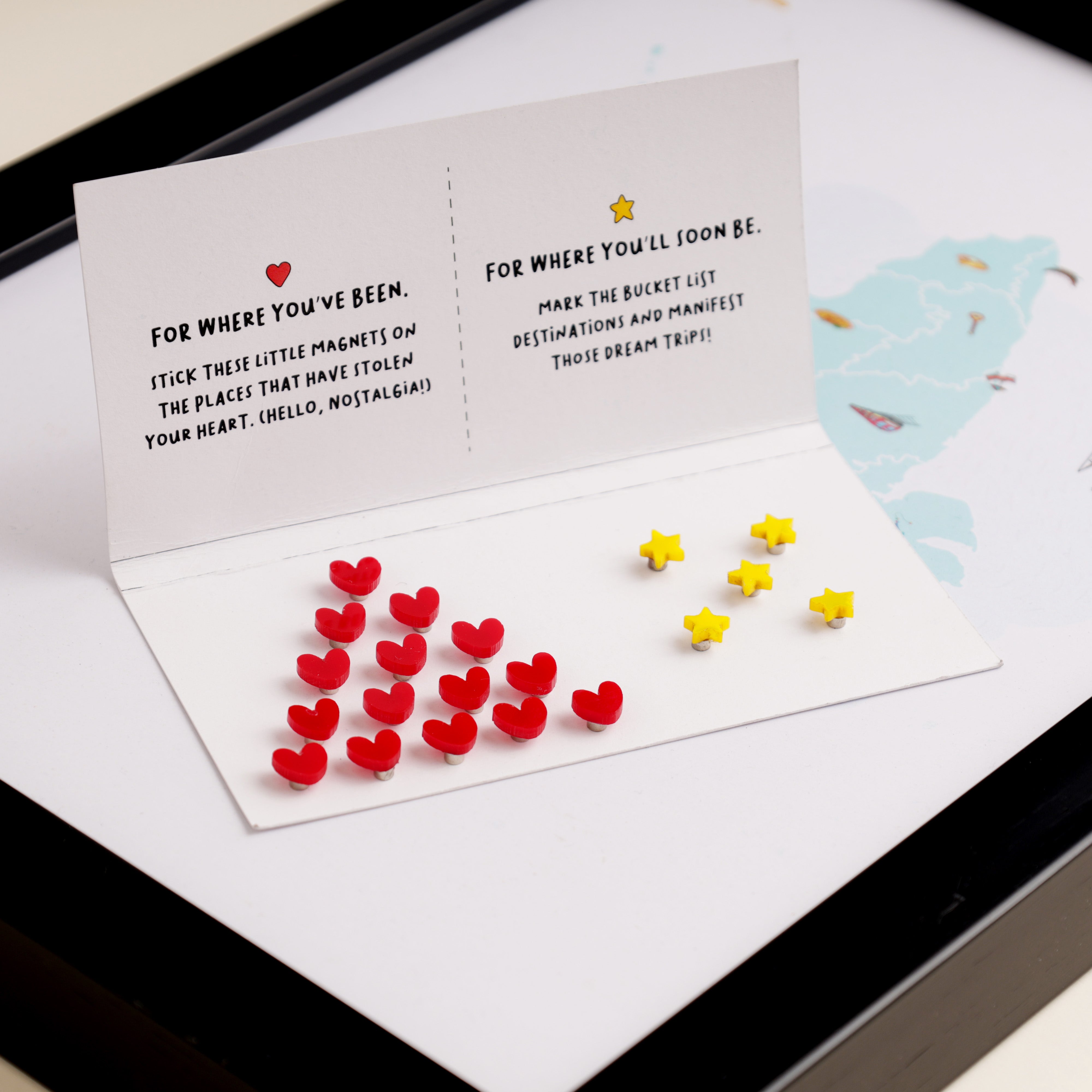 Each map comes equipped with 15 heart magnets to mark the places you've been to and 5 star magnets for the places on your bucket list. ​