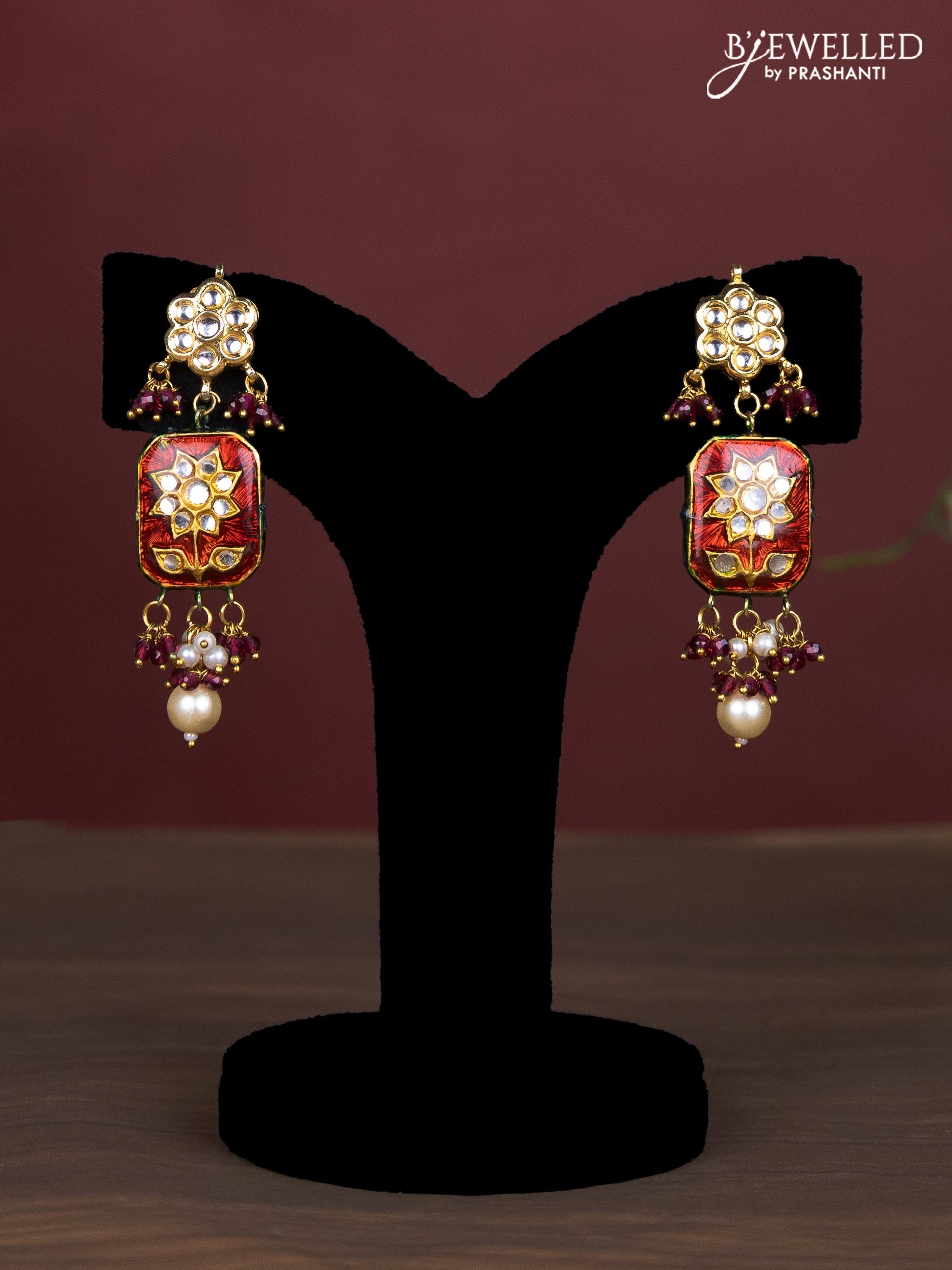 Jaipur multilayer beaded maroon necklace with meenakari pendant and pearl hangings
