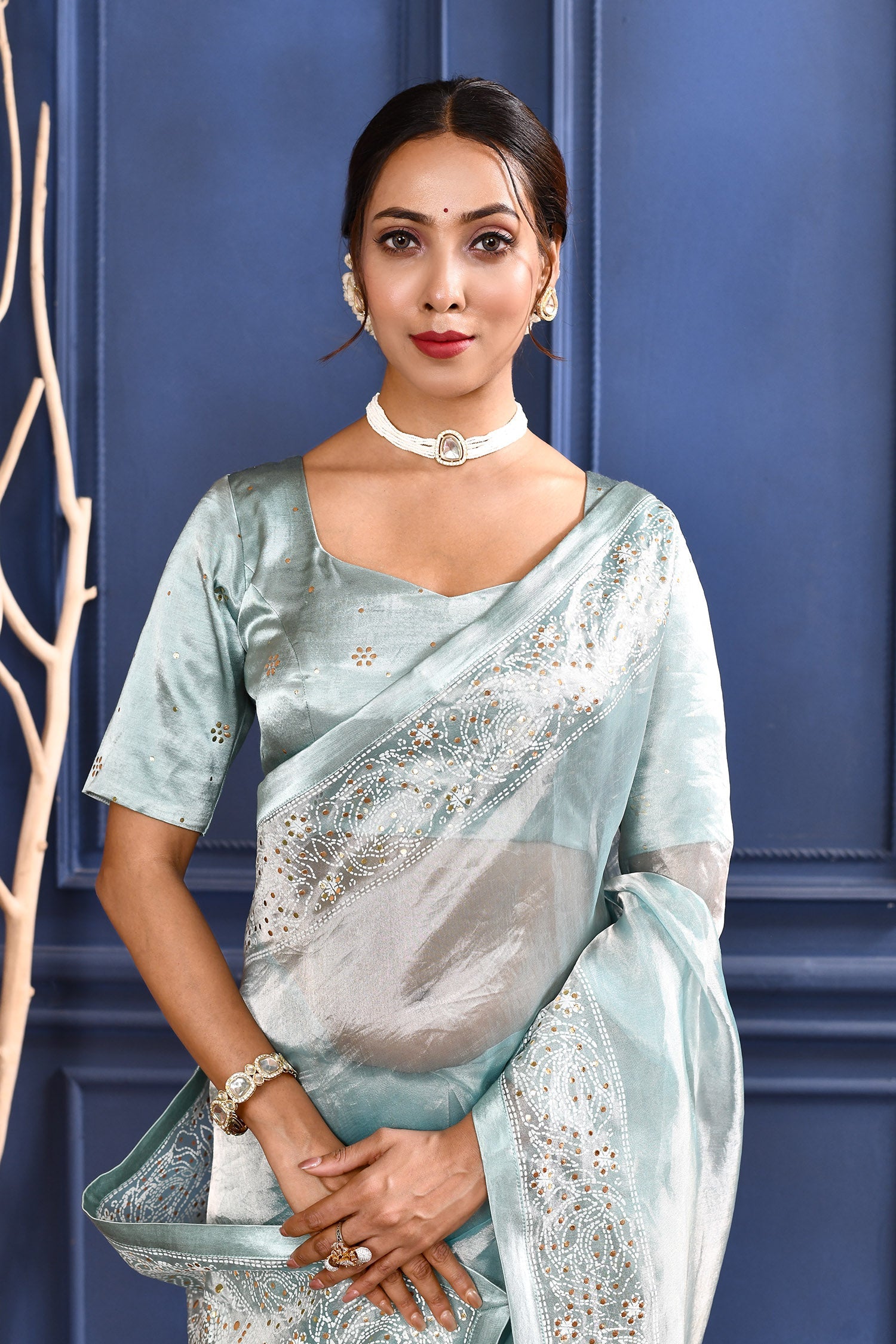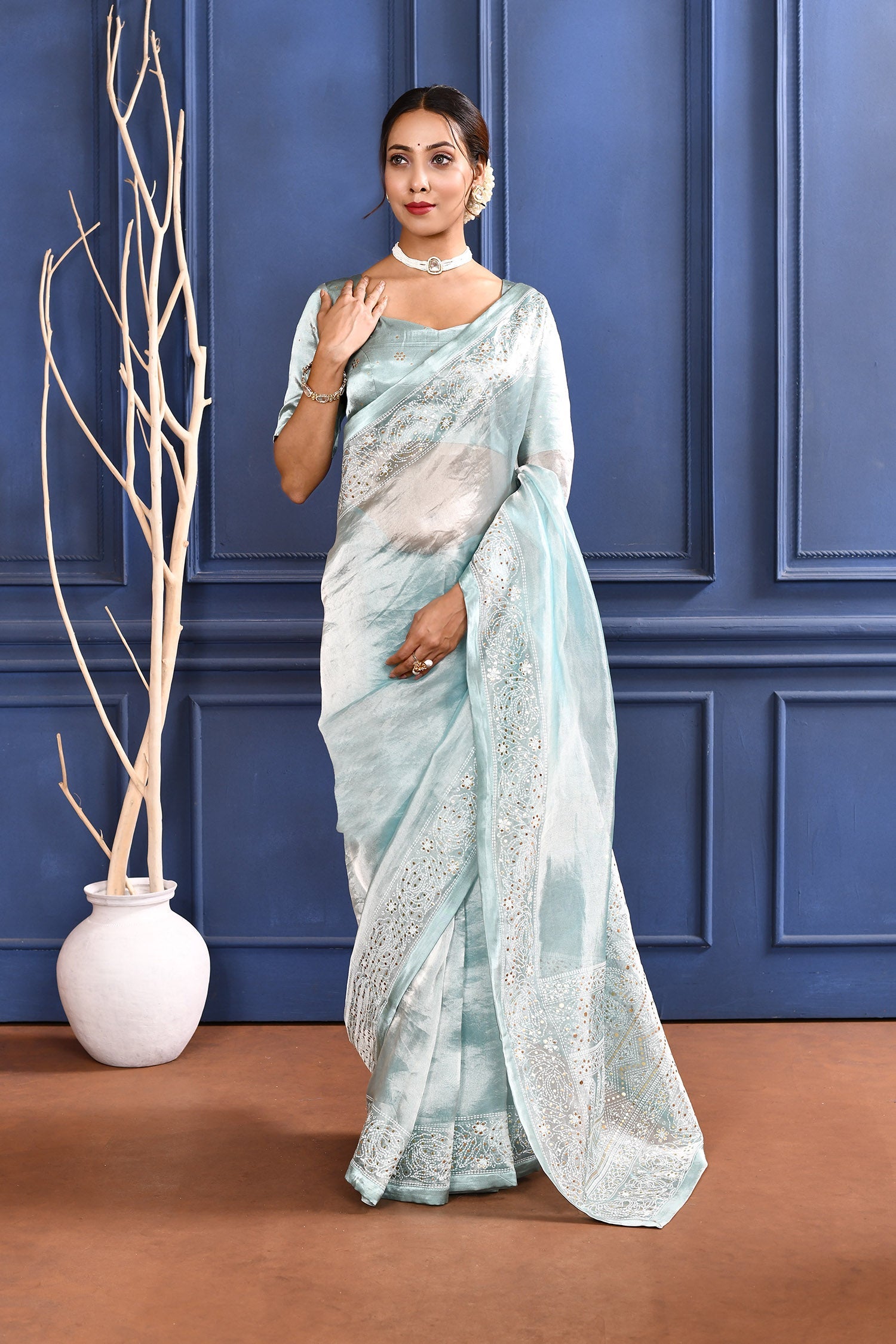The jewel blue foil printed tissue saree with self border and blouse for a rich look along with foil printed floral design for subtle grace.