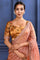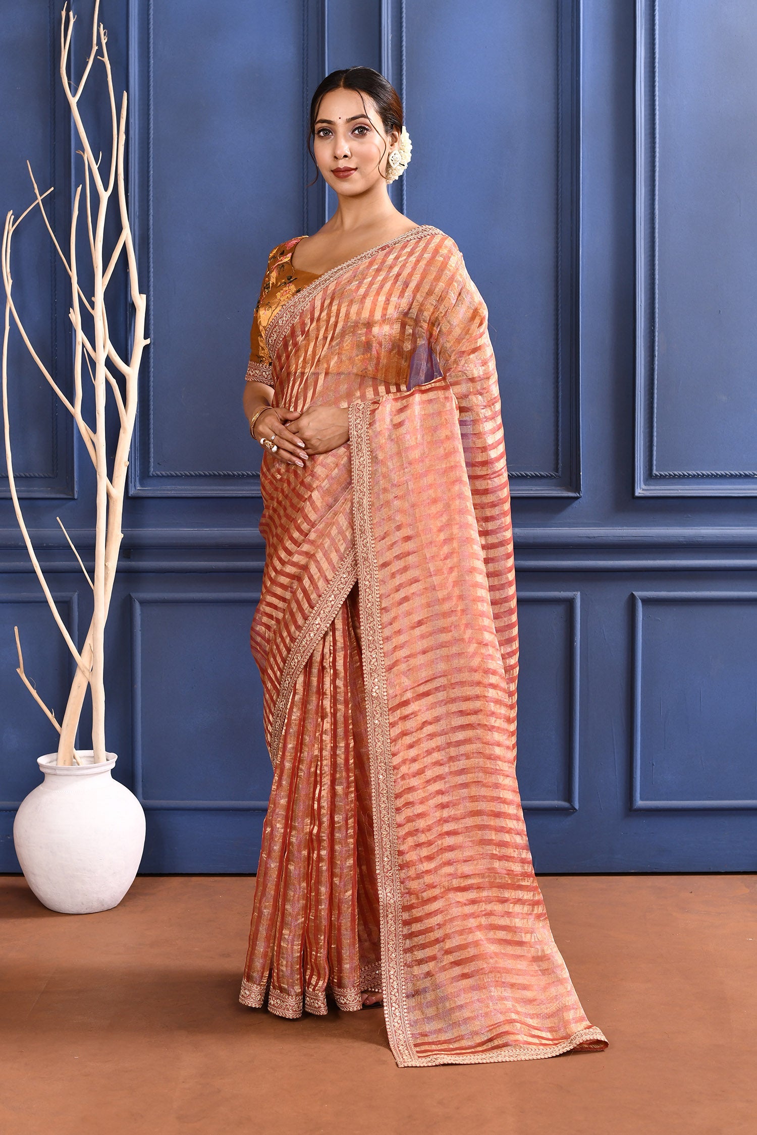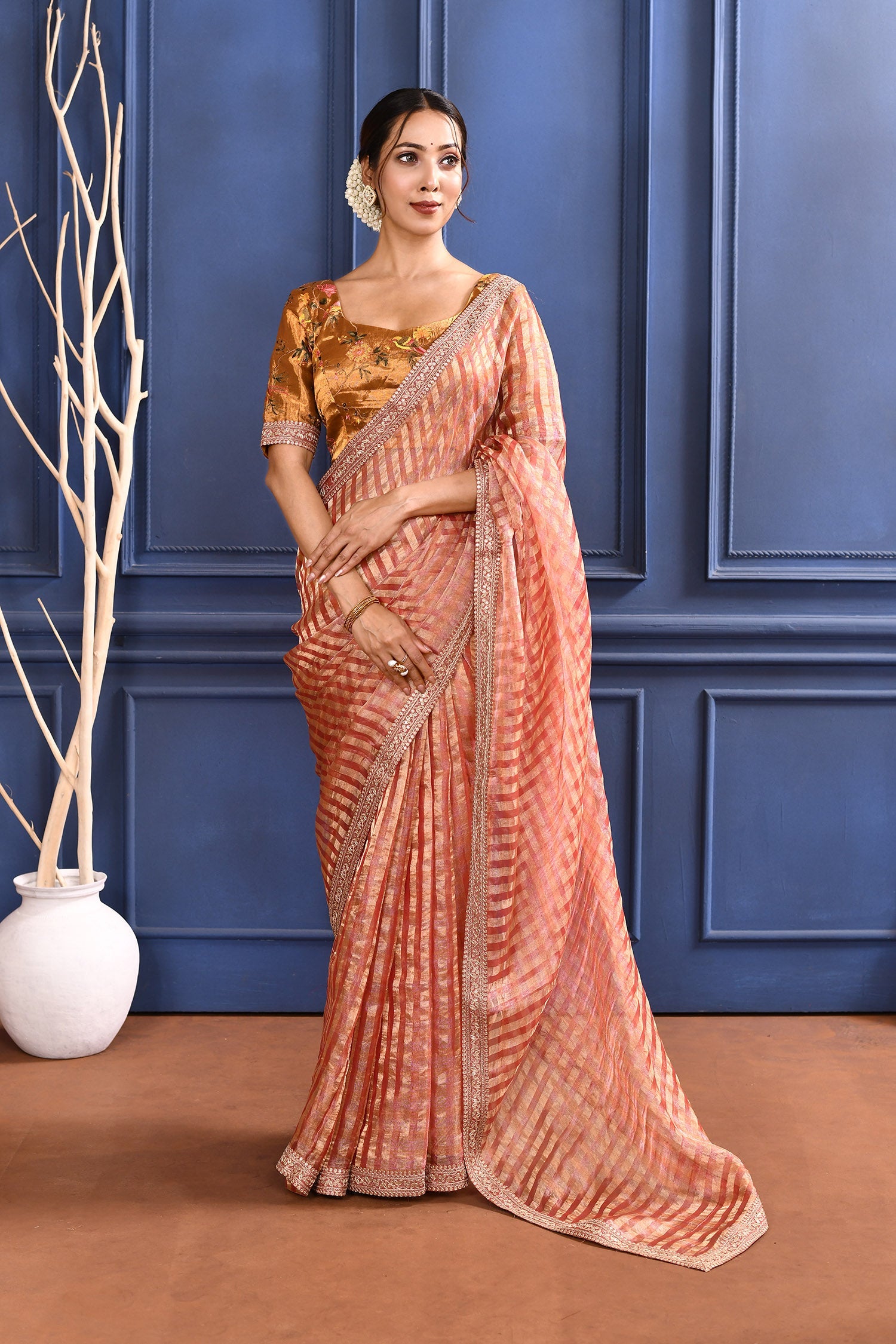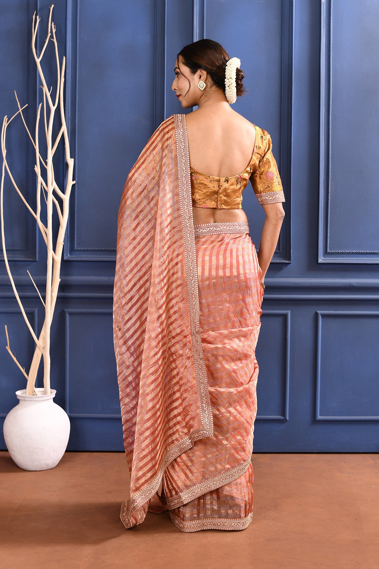 The jewel pink tissue saree with stripes and embroidered border along with stitched embroidered golden blouse for a stylish look with traditional elegance.