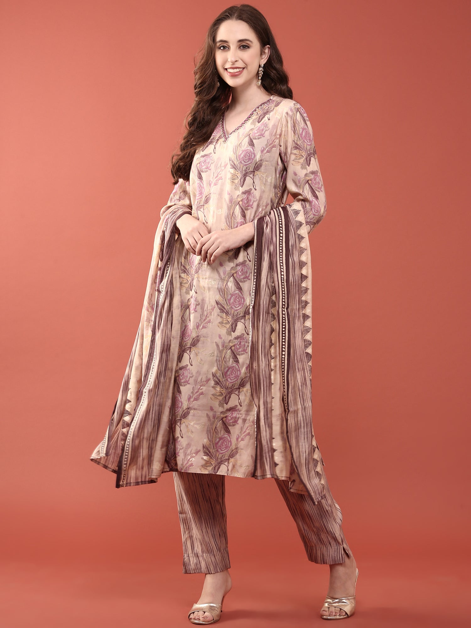 Elevate your ethnic wardrobe with this exquisite three-piece ensemble crafted from premium modal silk. The lavender base provides a sophisticated canvas for intricate floral digital prints that showcase contemporary design sensibilities. This versatile set combines comfort with elegance, making it ideal for festive occasions, celebrations, or refined everyday wear.