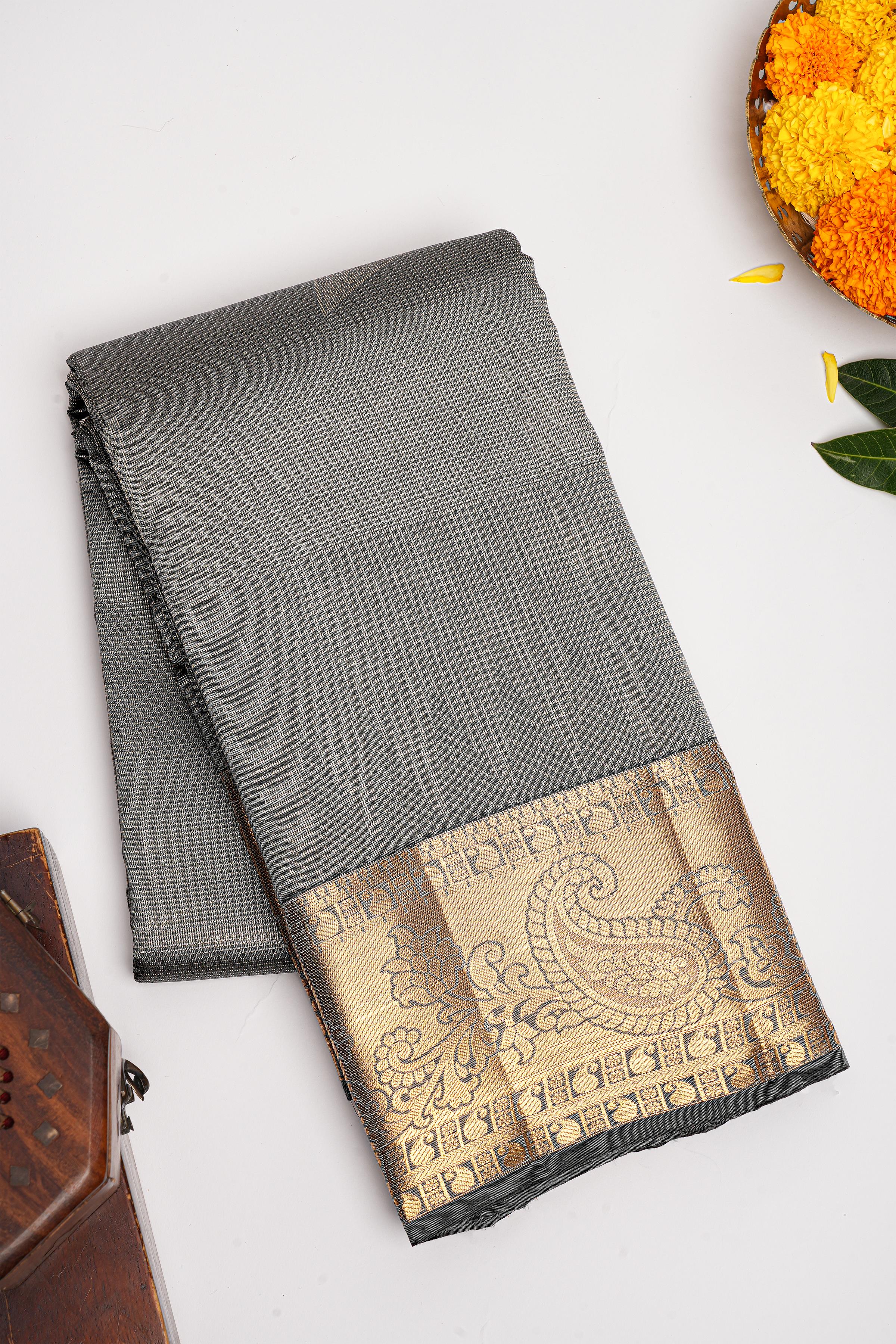 Latest LIGHT GREY BUTTIS SILK BLEND Saree with SELF ZARI border. This saree comes with PLAIN WITH BORDER SILK BLEND blouse.