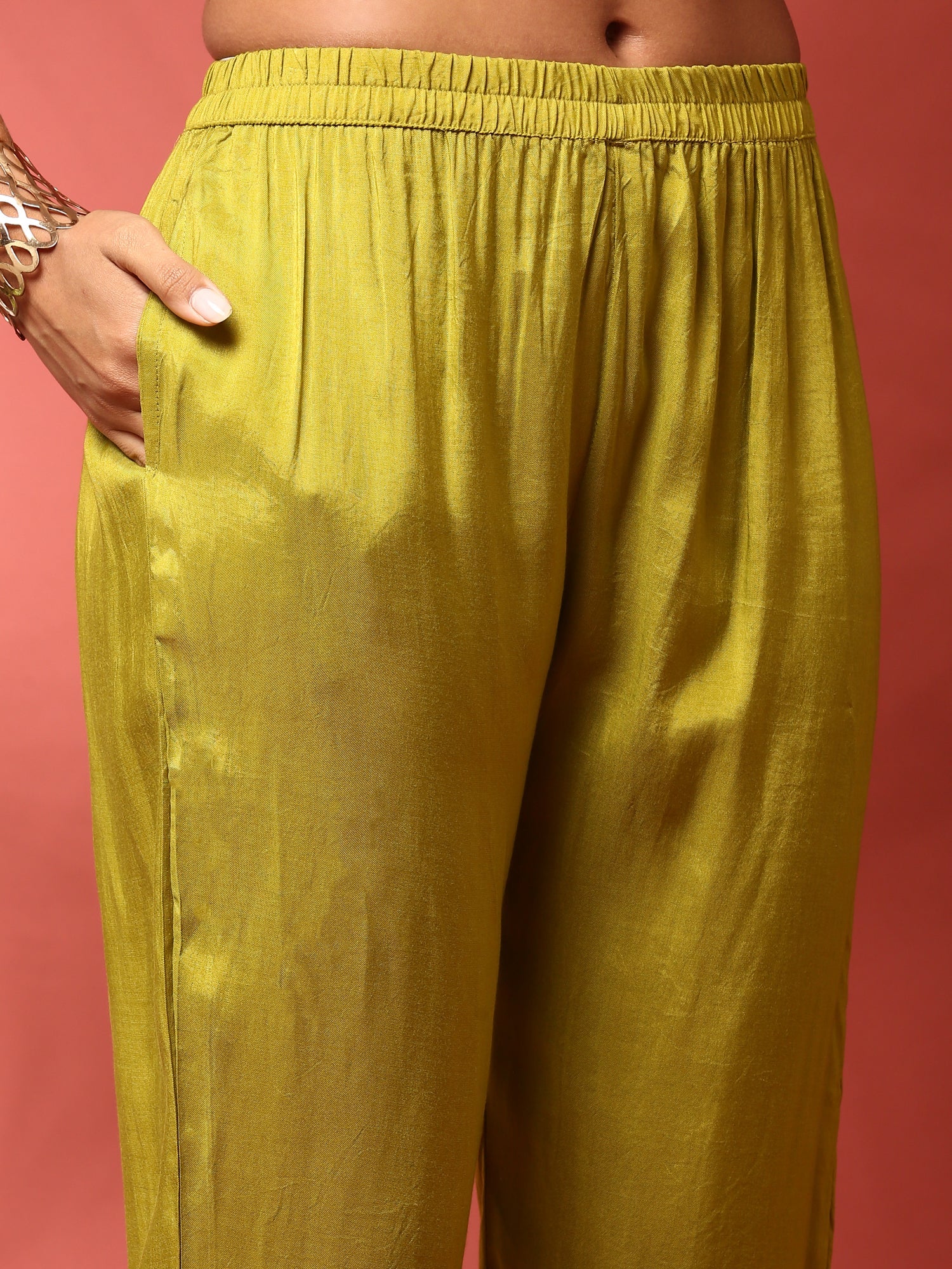 Elevate your ethnic wardrobe with this Mehendi green crepe three-piece suit set. Featuring a rich, calming green shade and silky crepe fabric, it offers both comfort and style. The set includes a beautifully tailored kurta, matching bottoms, and a coordinating dupatta, providing a complete look for festive occasions or casual gatherings.