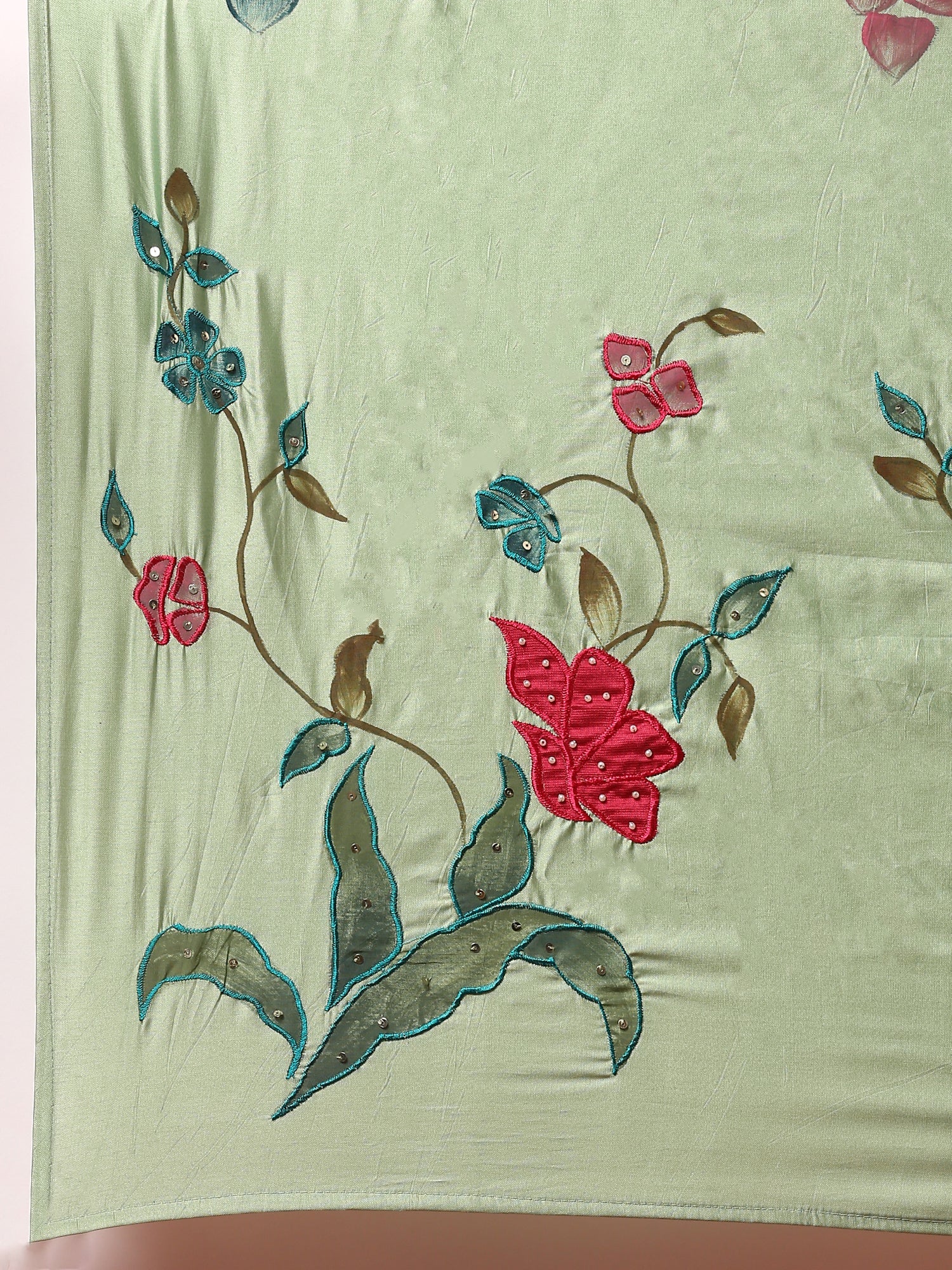 Elevate your ethnic wardrobe with this mint green silk anarkali suit set, adorned with intricate aalique work. This elegant three-piece ensemble combines timeless craftsmanship with a refreshing color that complements all skin tones. Perfect for festive occasions or special events, the flowing silhouette and delicate detailing offer both comfort and sophistication, making you stand out effortlessly.