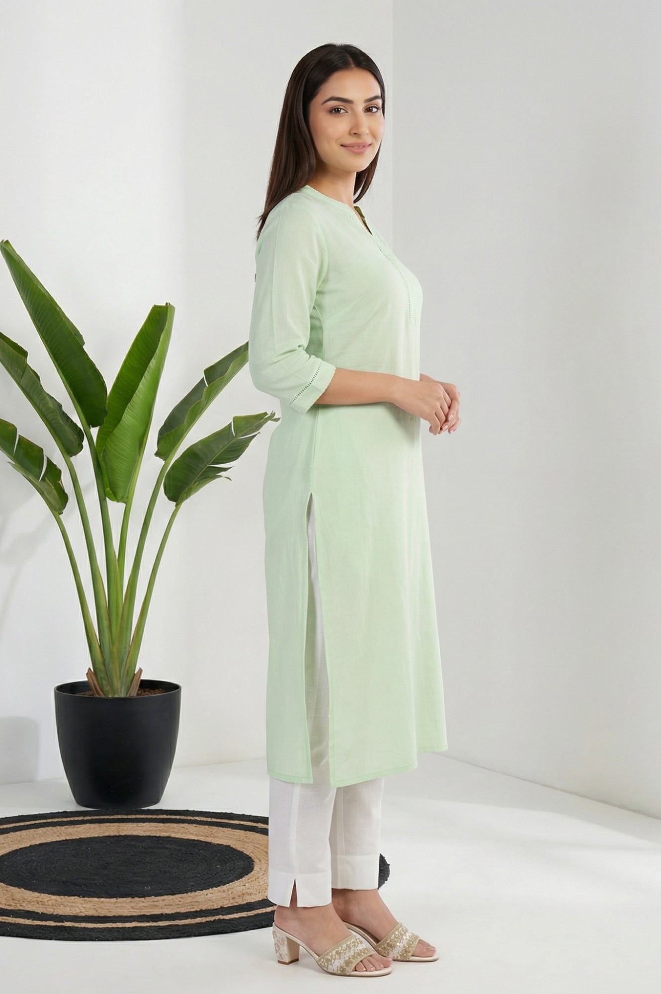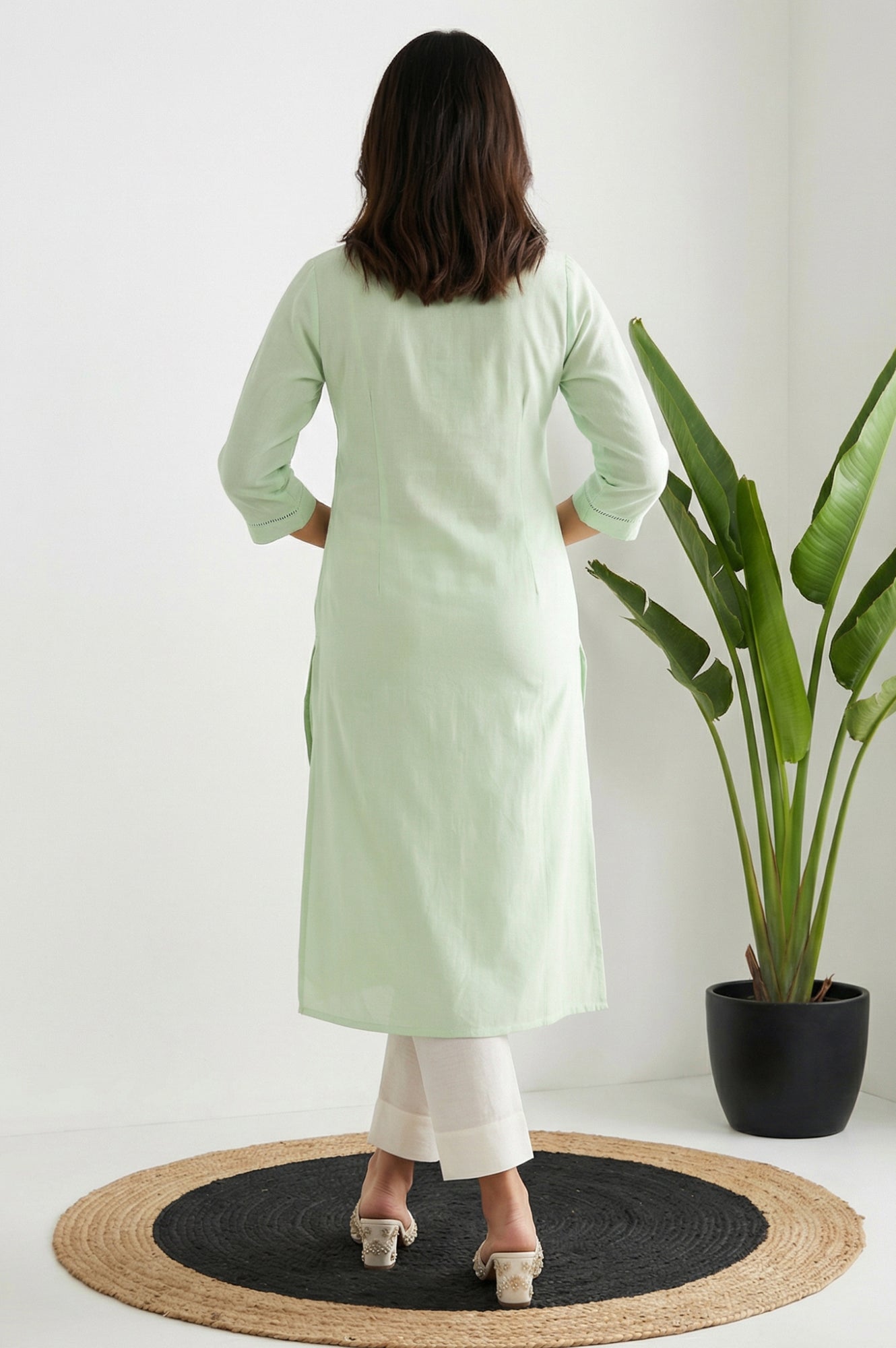 A refreshing addition to your wardrobe, this mint green straight-cut kurta is crafted from soft, breathable cotton, making it perfect for summer days. Featuring a mandarin collar and three-quarter sleeves, this kurta offers a sleek and elegant look. The side slits and straight hemline ensure ease of movement, while its solid design adds a touch of minimalistic charm. Pair it with white trousers or leggings for a chic and comfortable outfit, ideal for casual outings or office wear.