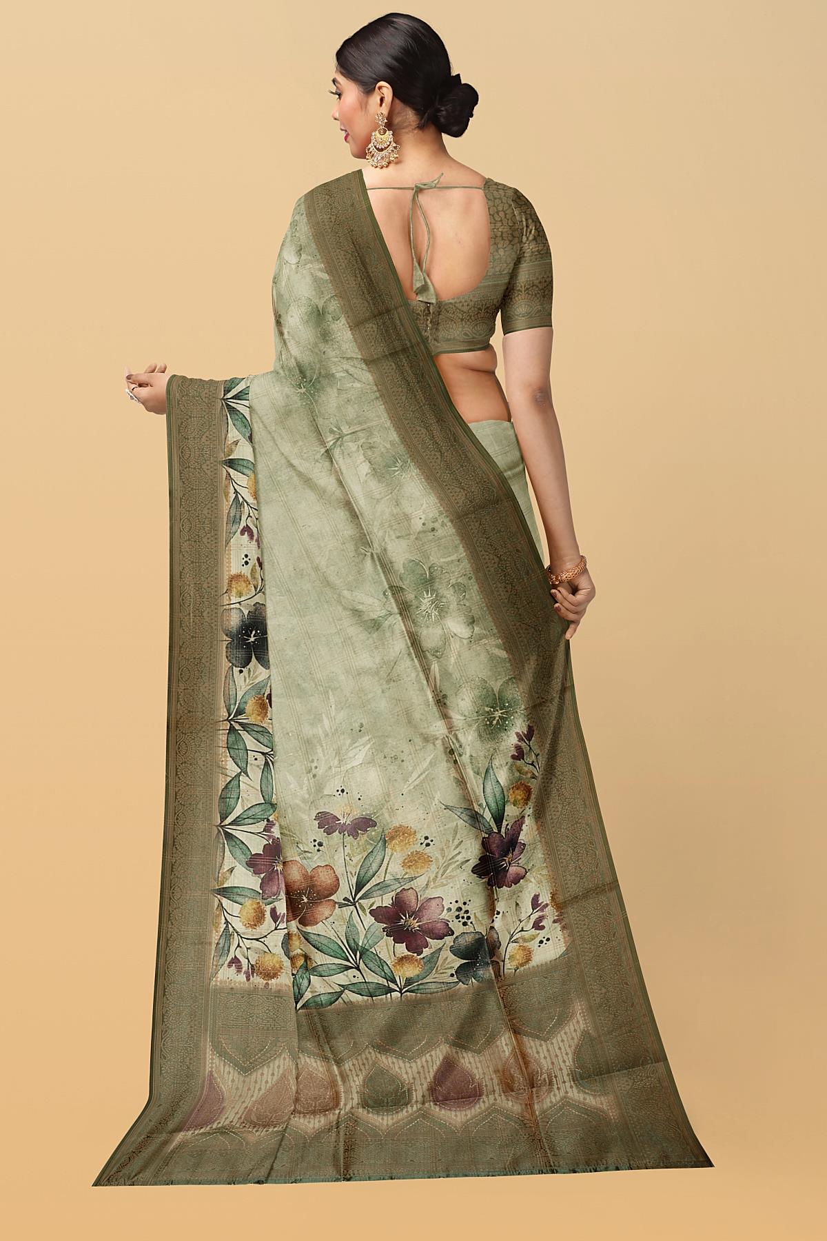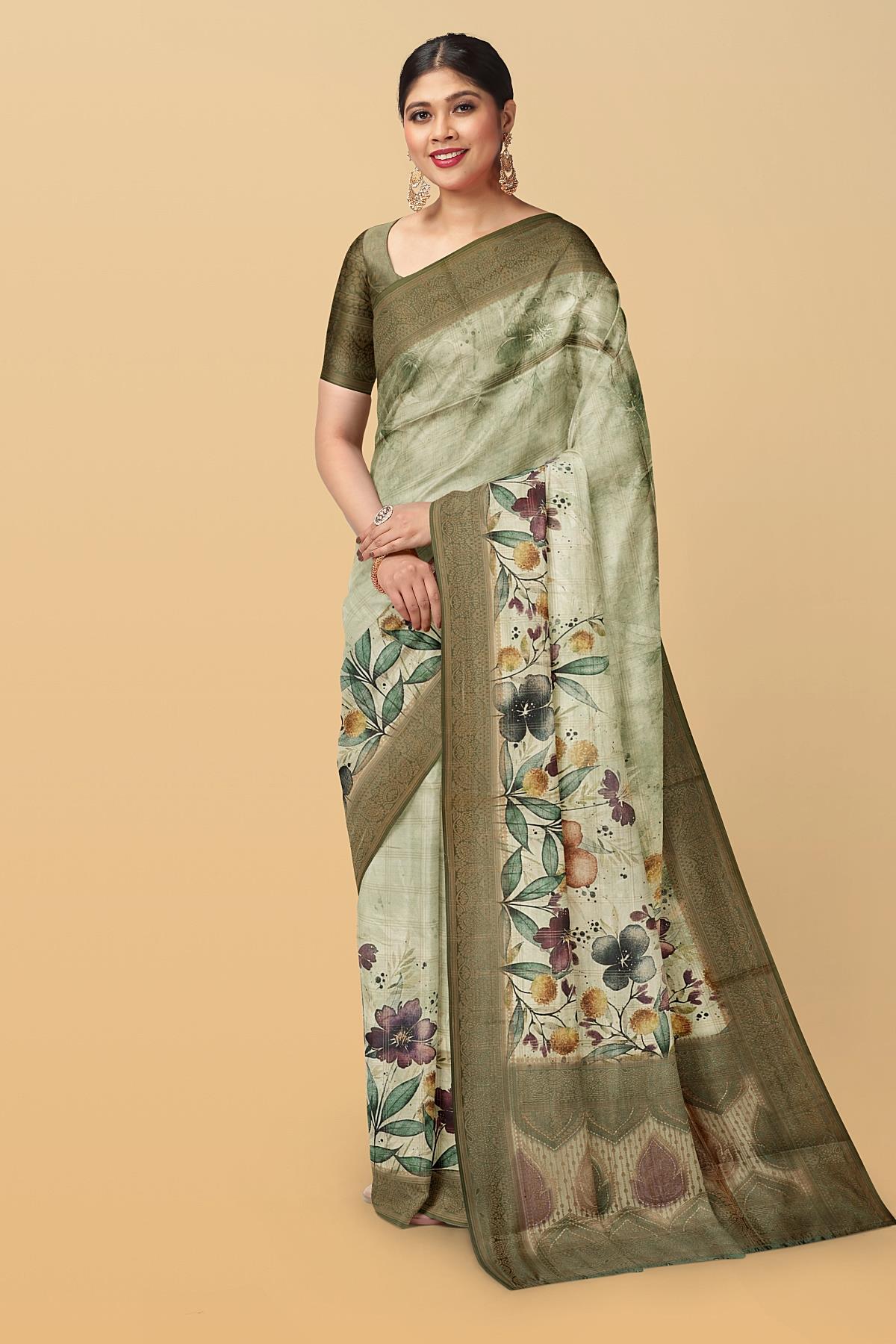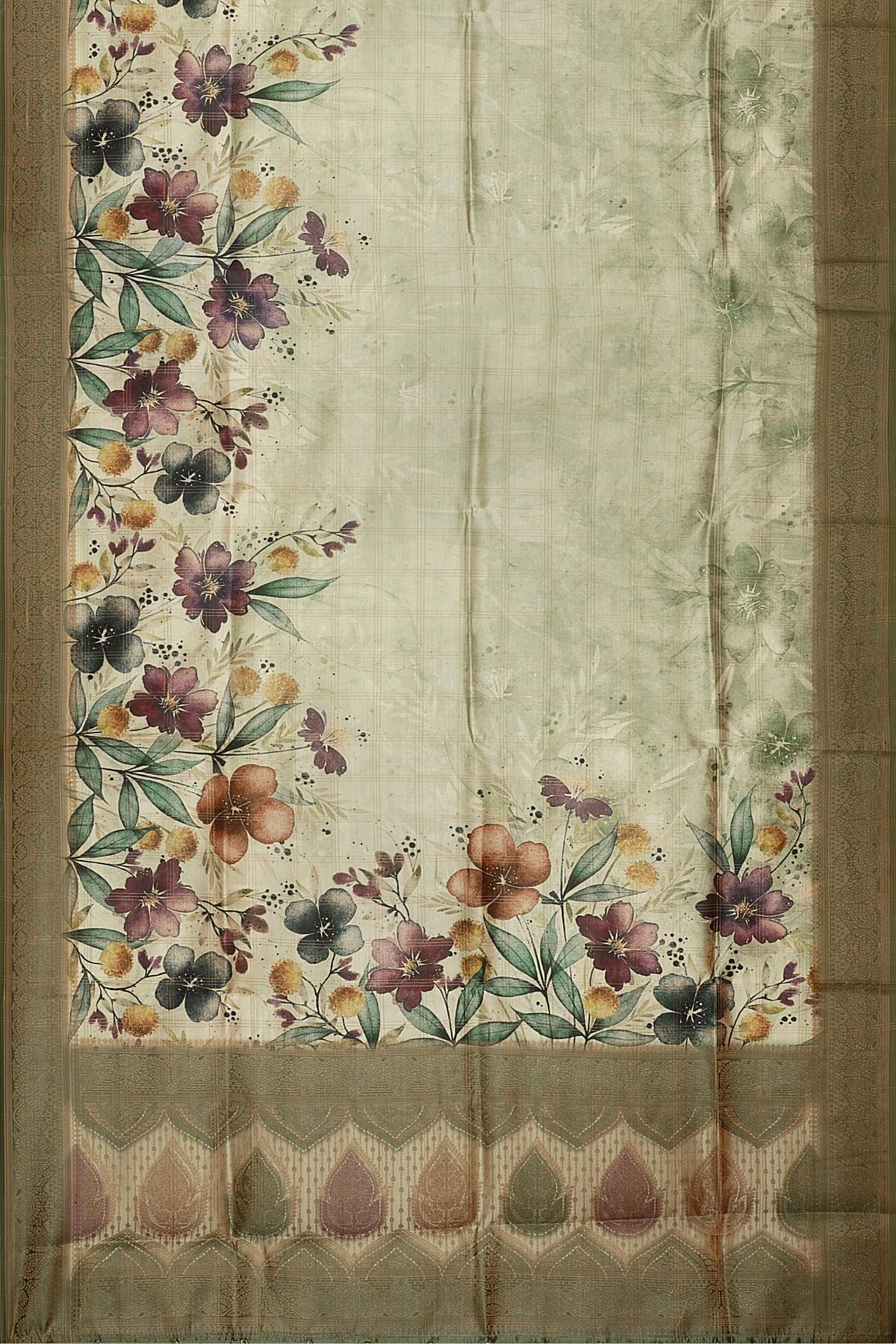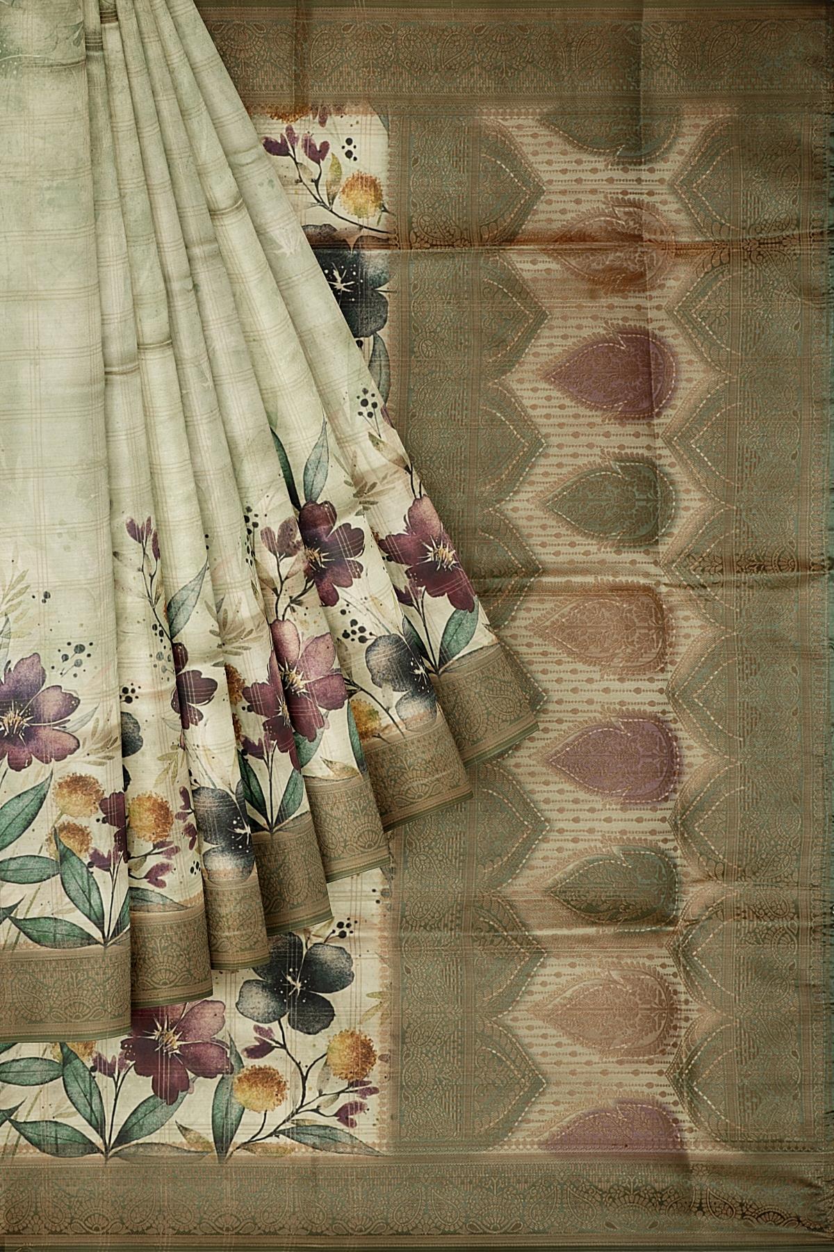 MULTI and OLIVE GREEN CHECKS & FLORALS TUSSAR SILK Saree with FANCY