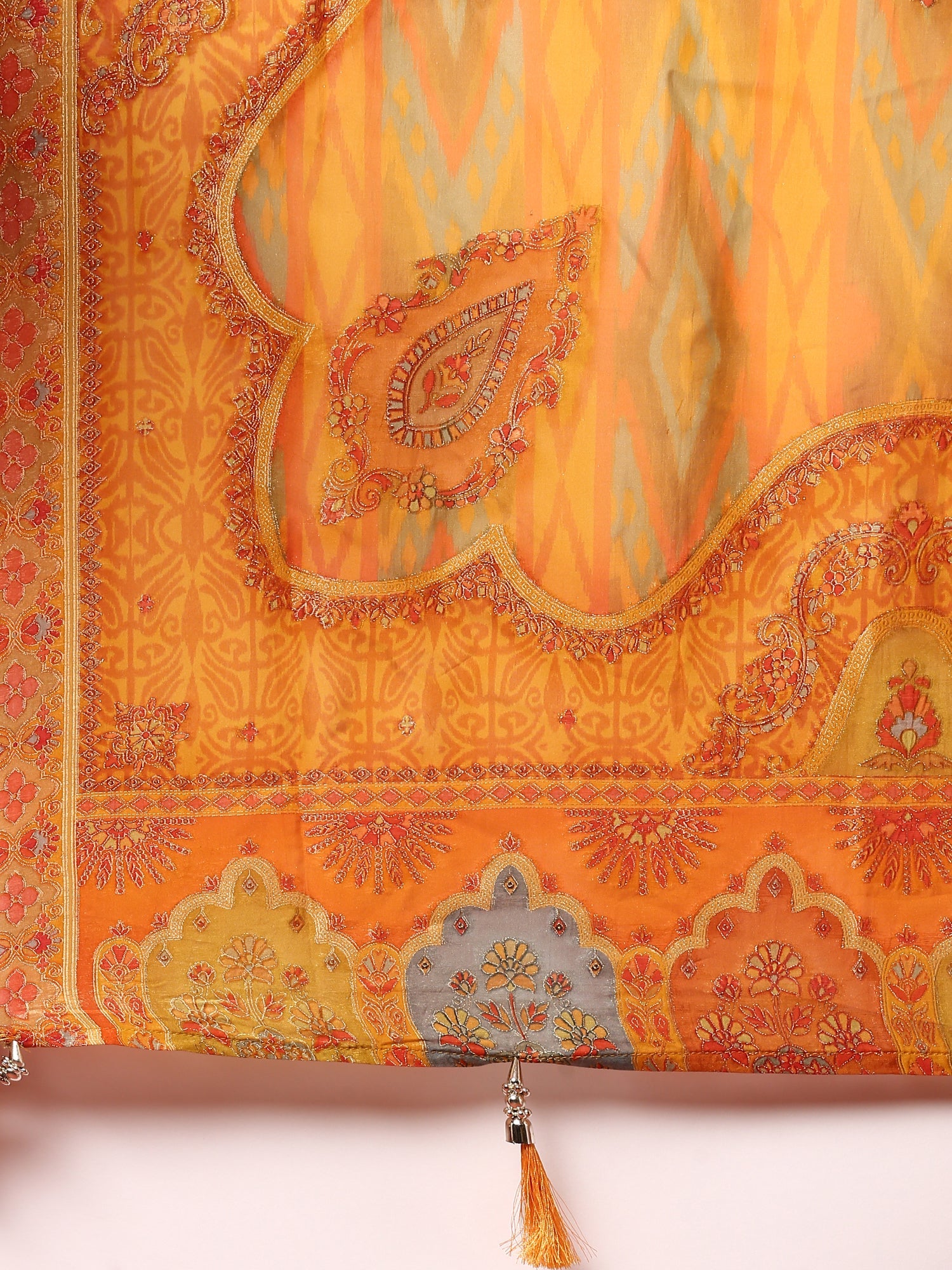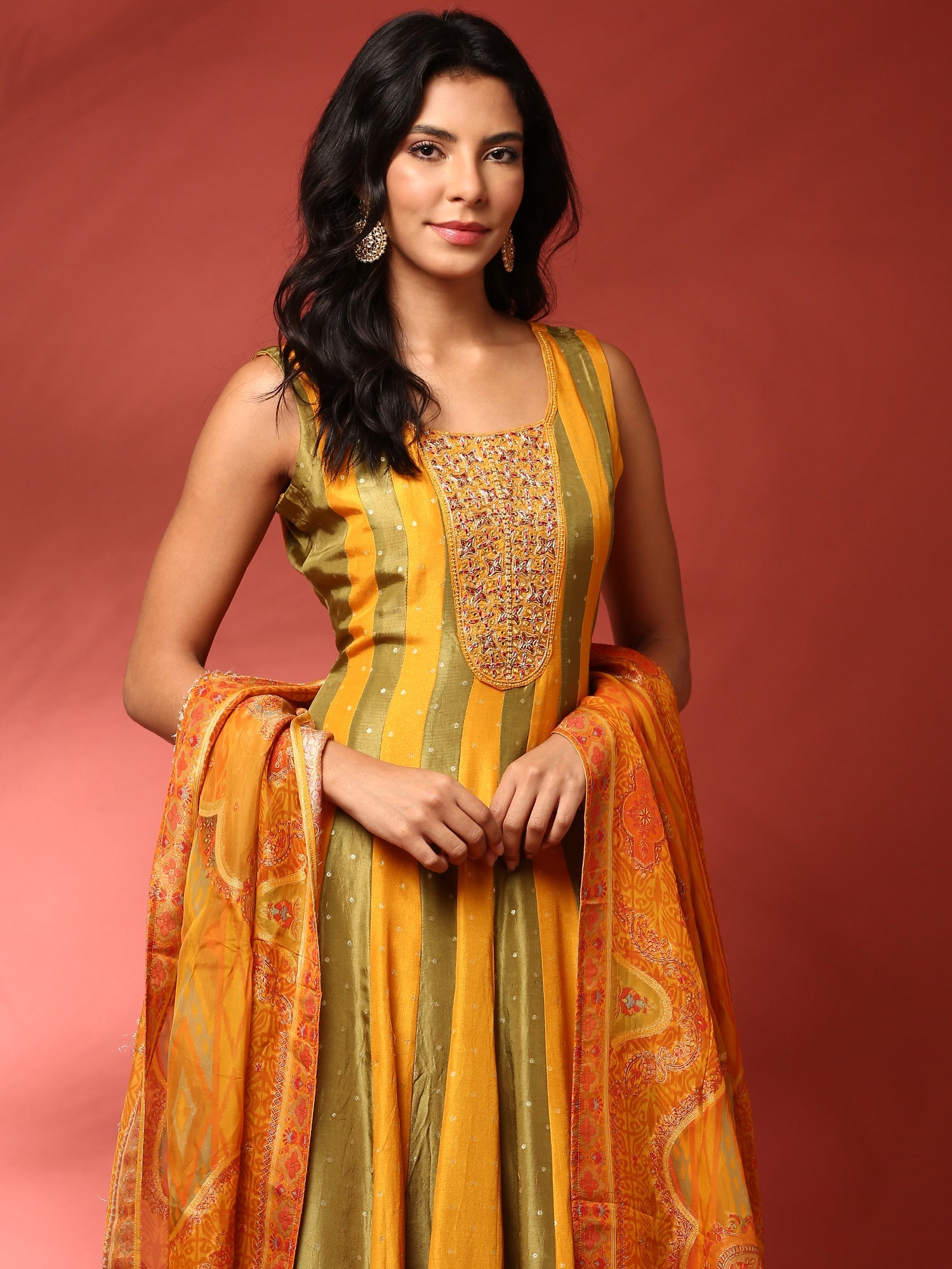 Mustard and green striped silk embroidered anarkali set