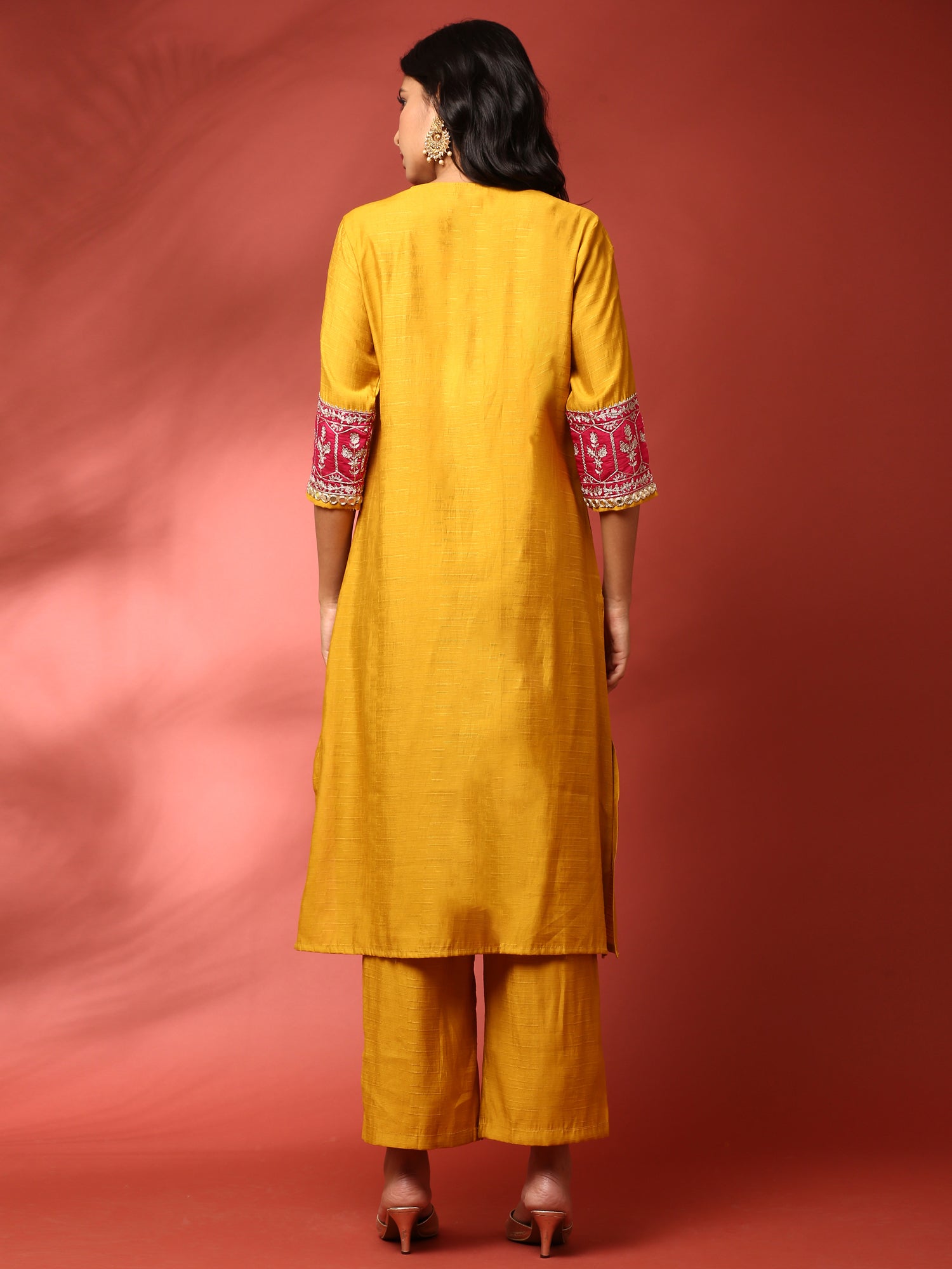 Mustard and Pink Silk Fabric Aari embriodery two piece cord set