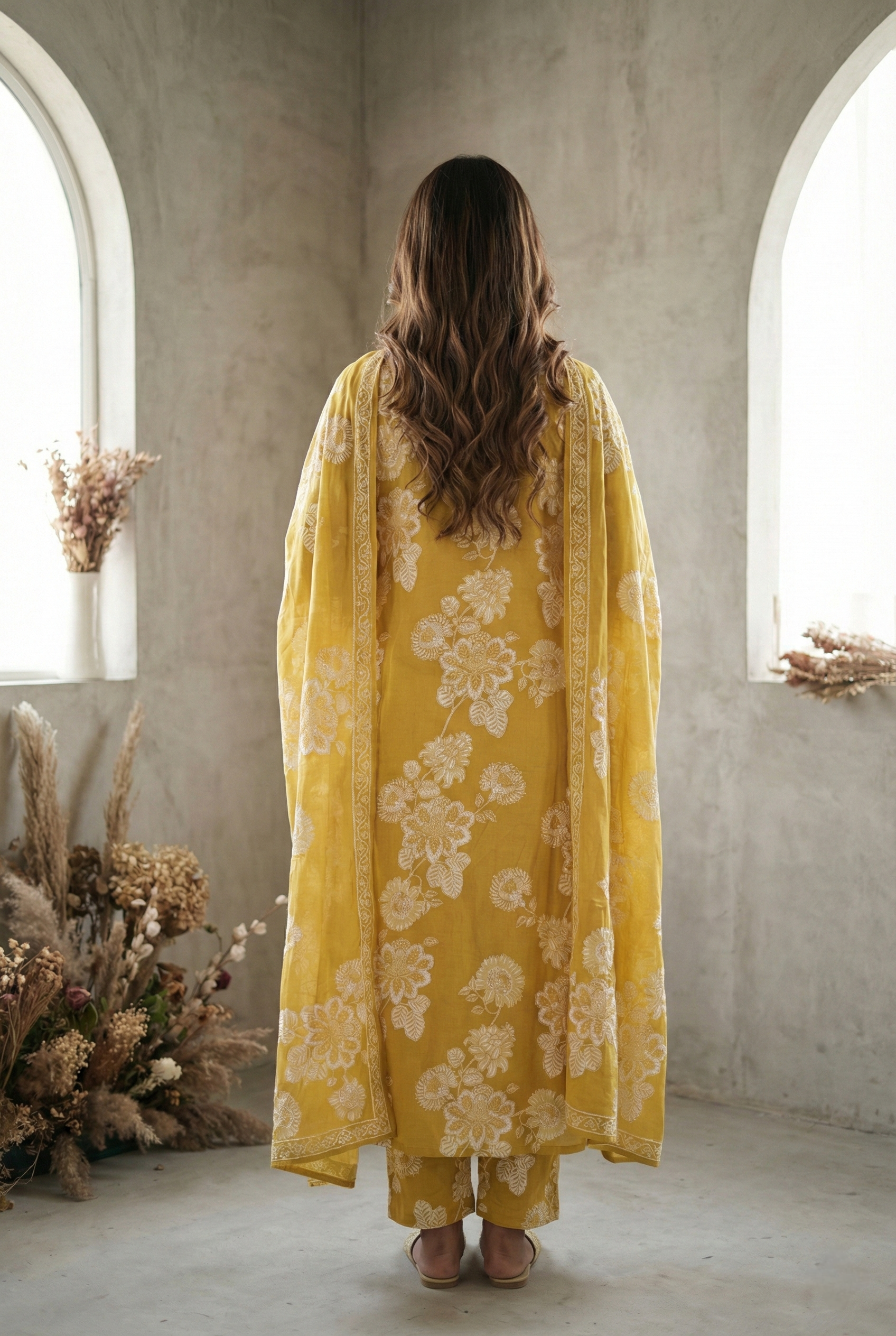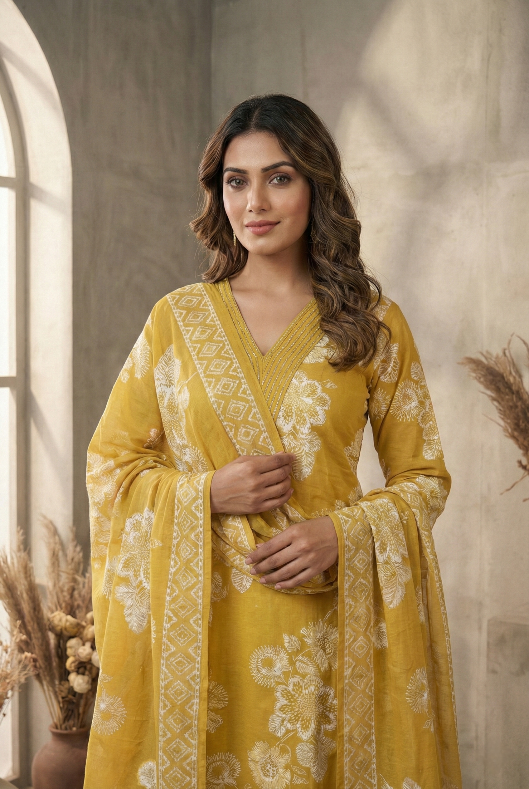 Elevate your ethnic wardrobe with this refined three-piece ensemble, crafted from premium cotton and adorned with intricate thread embroidery. The sophisticated mustard palette is complemented by delicate floral prints that add timeless elegance to your collection. Each piece is thoughtfully designed to offer versatility—wear them together for a coordinated look or style separately for multiple occasions. Perfect for celebrations, gatherings, or everyday sophistication, this set combines traditional craftsmanship with contemporary aesthetics. Experience the comfort of natural cotton paired with exquisite detailing that speaks to refined taste.