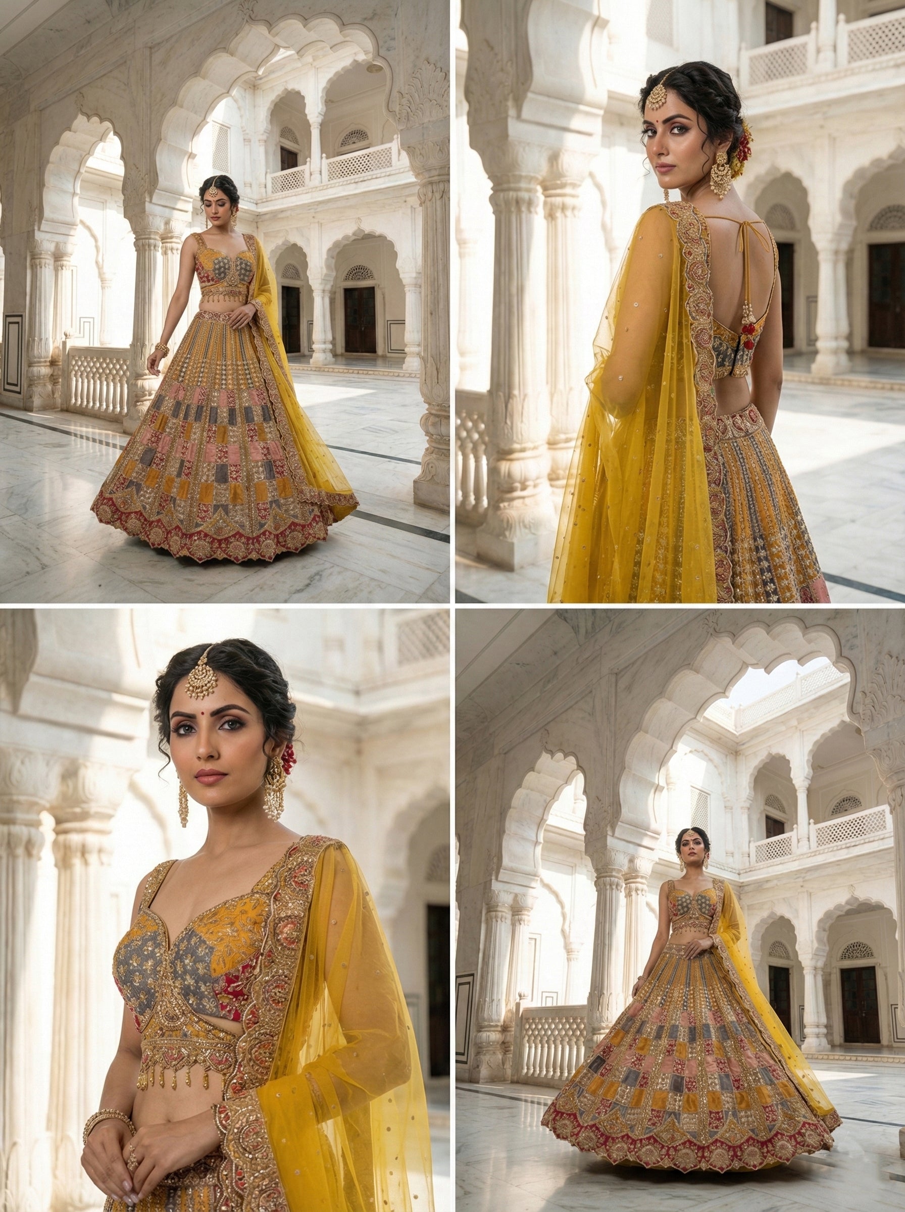 Elevate your festive wardrobe with this exquisite mustard silk ghagra set, a masterpiece of traditional craftsmanship. Each piece showcases meticulous hand embroidery, featuring intricate threadwork that catches light beautifully. The rich mustard hue complements all skin tones, while the luxurious silk fabric drapes elegantly for a graceful silhouette. Perfect for weddings, celebrations, and special occasions, this set combines timeless artistry with contemporary sophistication. The heavy embroidery work demonstrates exceptional attention to detail, making it a treasured addition to your ethnic collection.