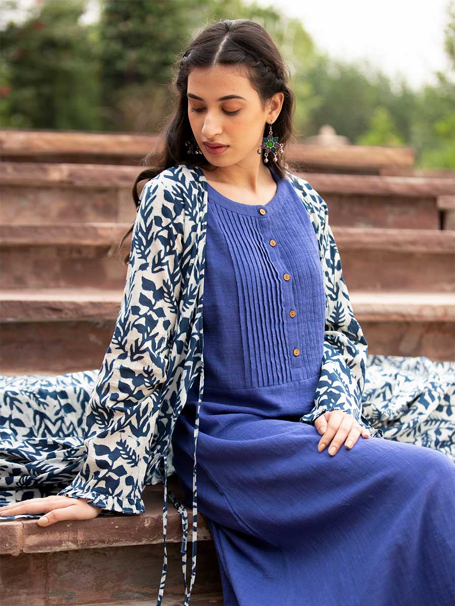 A daabu hand block printed angrakha jacket featuring a dramatic flair. It can be left open or tied using the tassel strings provided on each side. This listing is only for angrakha jacket. Our model is 5'6" and is wearing S.