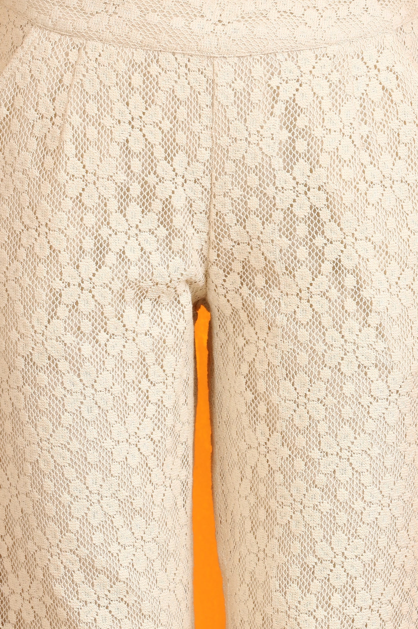 Exude timeless elegance with these off-white cotton nylon lace trousers. Crafted from soft and breathable cotton, these pants offer all-day comfort with a touch of sophistication. The delicate lace detailing adds a feminine and elegant charm, making them a perfect choice for both casual and festive occasions. Designed with a relaxed yet structured fit, these versatile trousers pair beautifully with kurtas, tunics, or tops. Style them with minimal accessories and classic footwear for an effortlessly chic and graceful look.