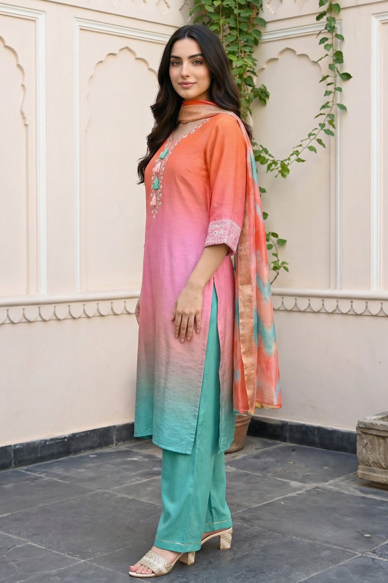 Orange Ombre Embroidered Straight Kurta with Palazzo and Dupatta Set