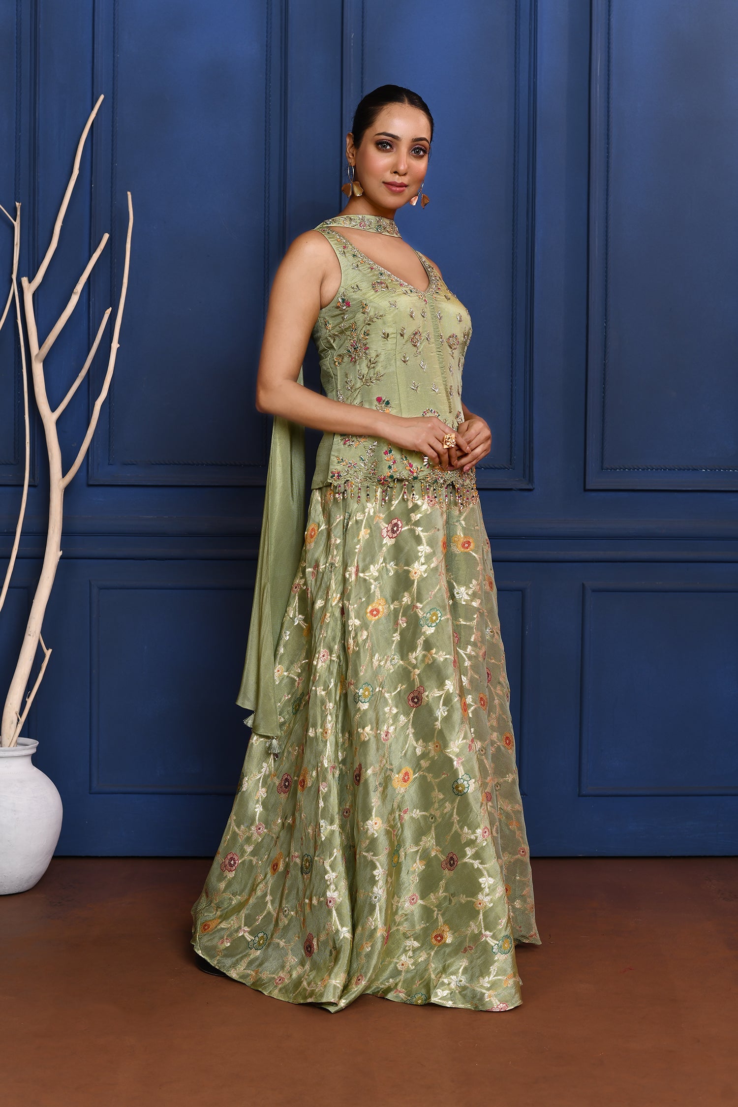 The pastel green floral tissue indo-western set with floral embroidered top and zari woven sharara along with matching dupatta for a stylish elegant look.