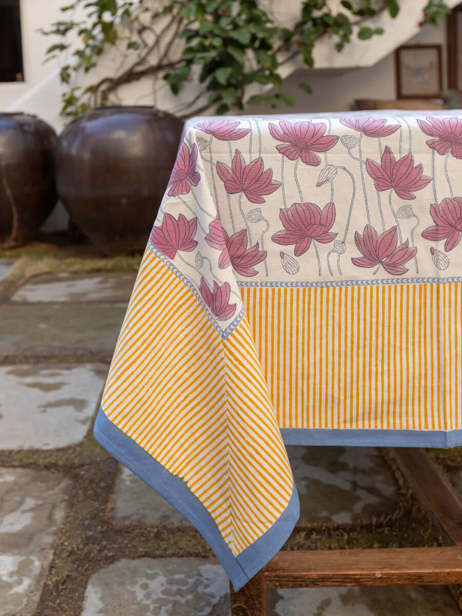 Padma or the Lotus is a central figure in many art forms including Pichhwai. It's a flower with meaning, beauty, and great cultural significance. The origin of the Lotus in Hindu mythology goes as far back as 'Samudra Manthan'. Its first association is with Lakshmi who also emerges from 'Samudra', hence, is referred to as Padmaja or Padmavati. This hand block printed home textiles collection is inspired by the beautiful lotus and other nature inspired elements.