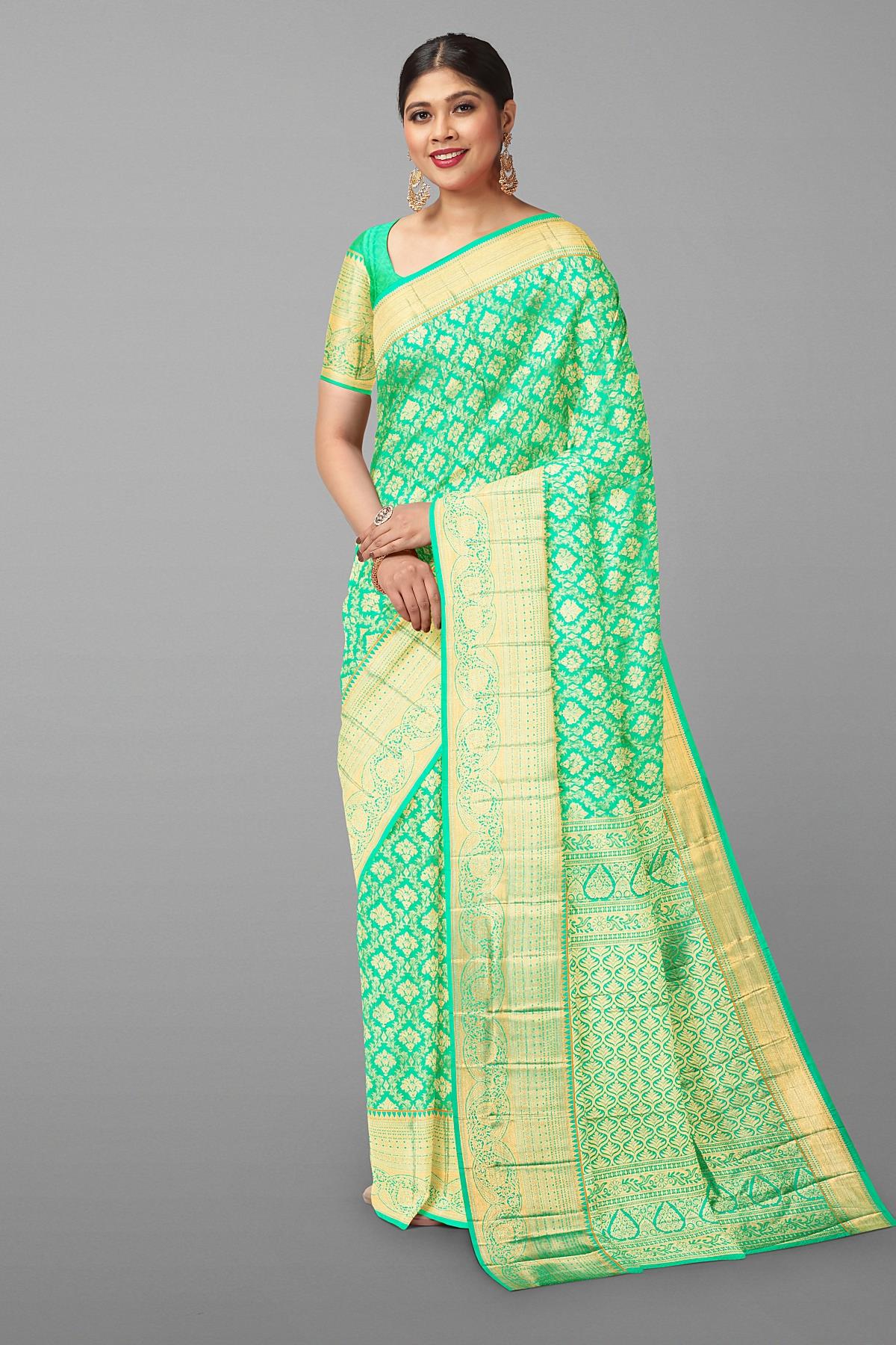 SEA GREEN and GOLD FLORAL JAAL SILK BLEND Saree with SEMI PATTU