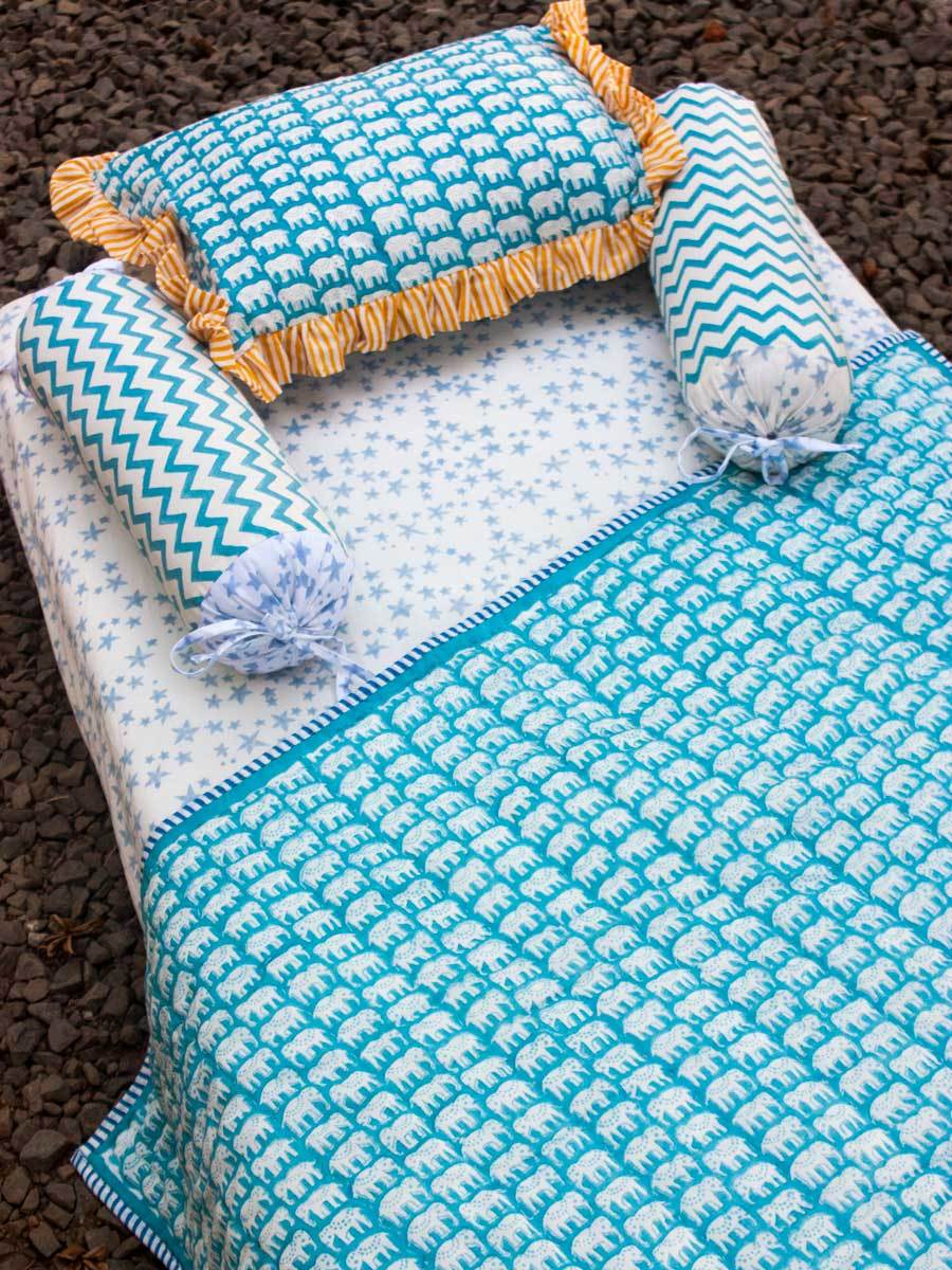Presenting playful crib/cot hand block print GOTS certified organic cotton fitted sheets. The sheet contains elastic on the sides for easy operation and a snug fit. Made to fit all standard sizes of cots and cribs.