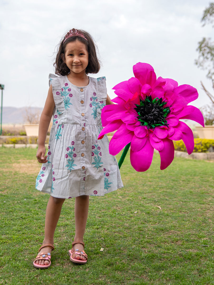 A lovely short dress accented with frills and coconut shell buttons! Crafted in 100% GOTS certified organic cotton, these hand block print dresses make for a chic addition in your child's wardrobe. The dress has a button hole at the back for easy wearing.