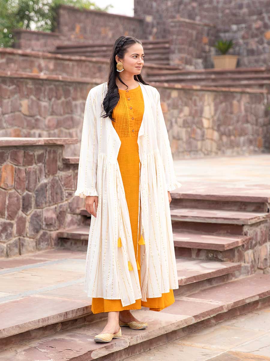 A hand block printed angrakha jacket featuring a dramatic flair. It can be left open or tied using the tassel strings provided on each side. This listing is only for angrakha jacket. Our model is 5'6" and is wearing S.