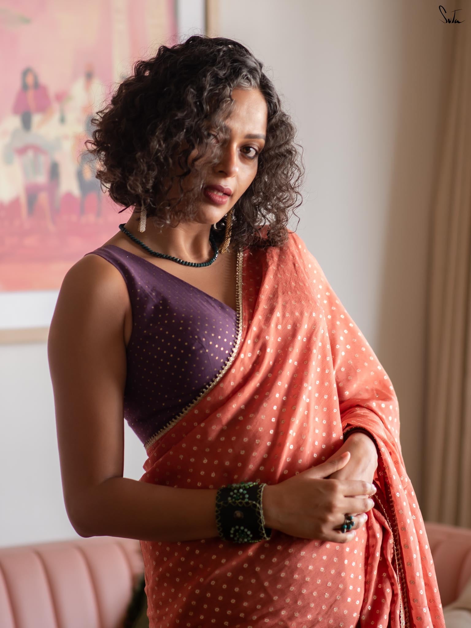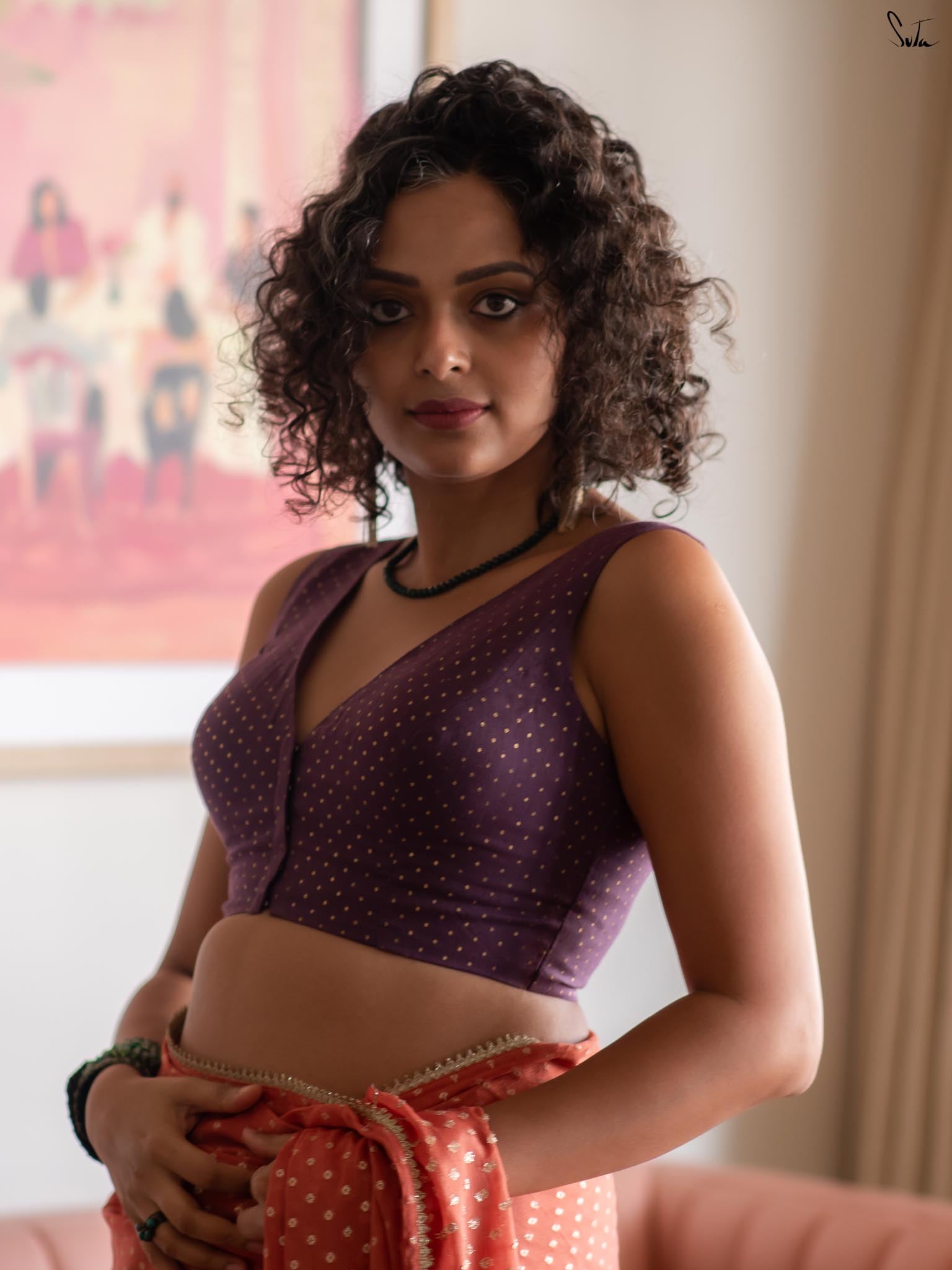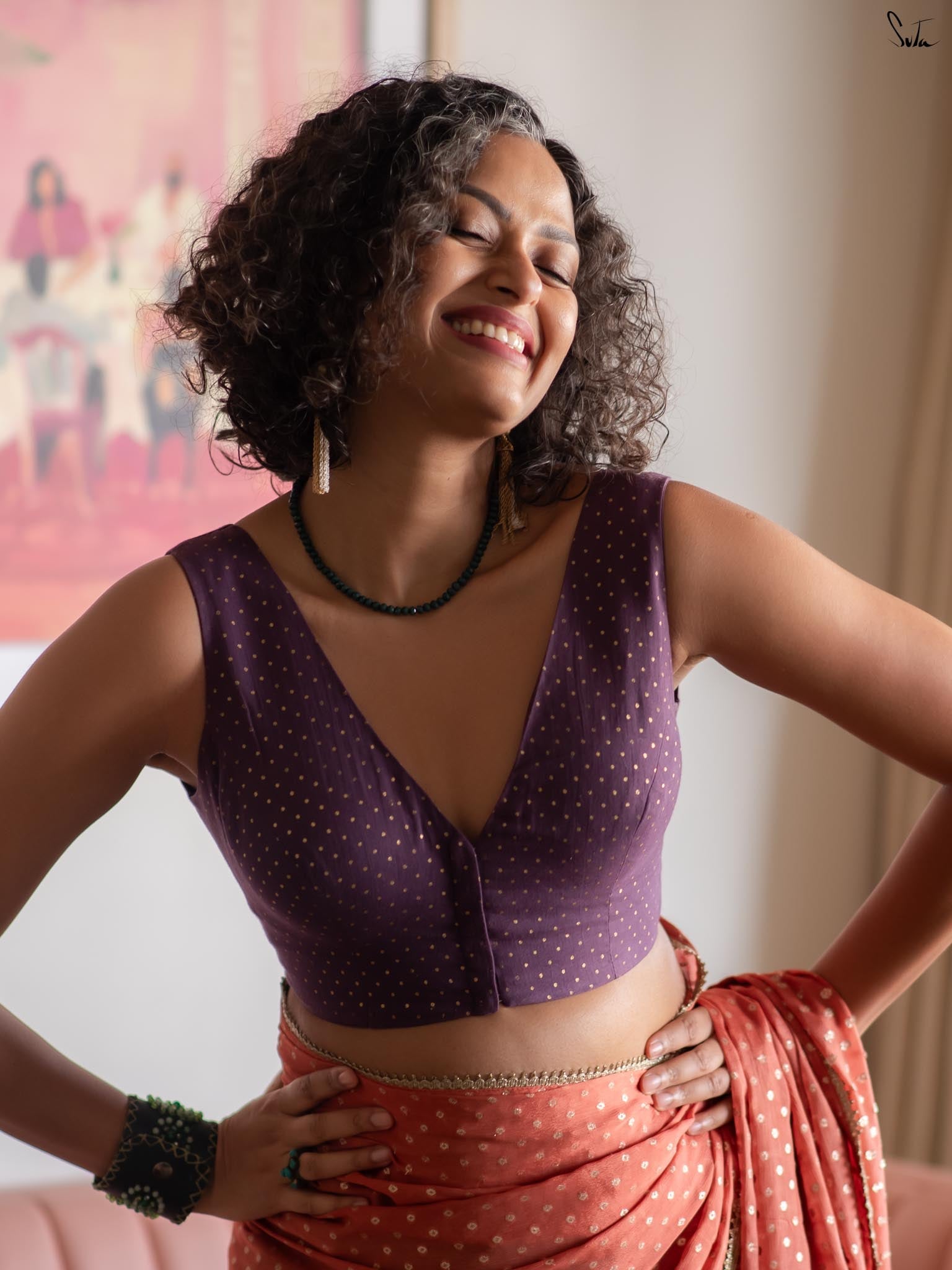 Elegant with a hint of sparkle, this blouse pairs effortlessly with both bold and subtle drapes.