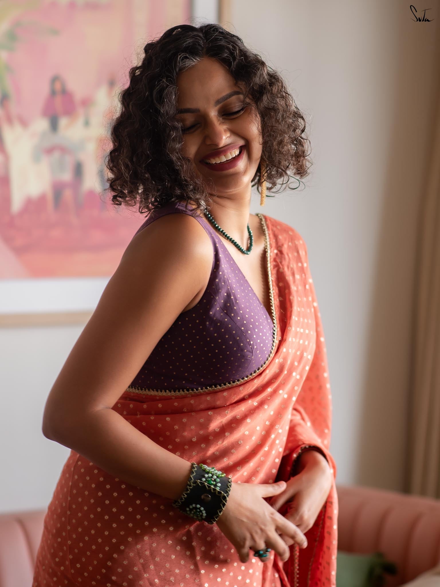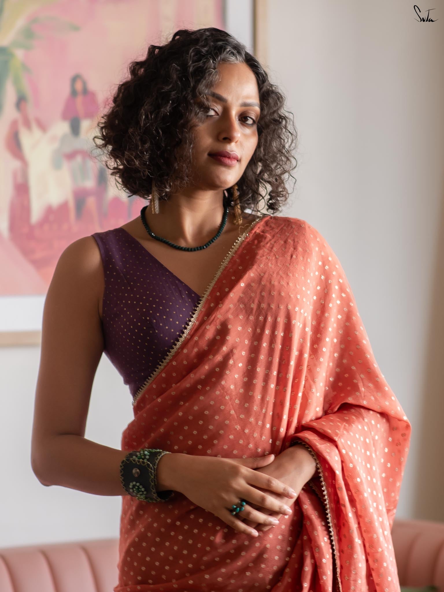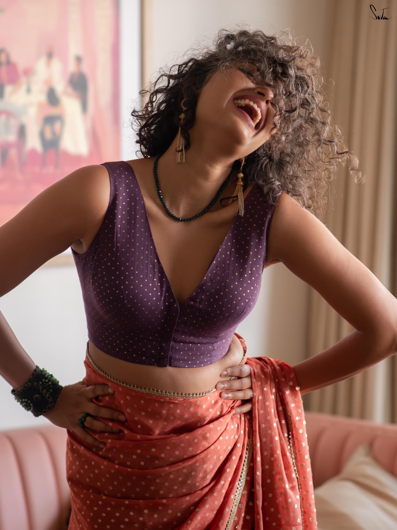 Elegant with a hint of sparkle, this blouse pairs effortlessly with both bold and subtle drapes.