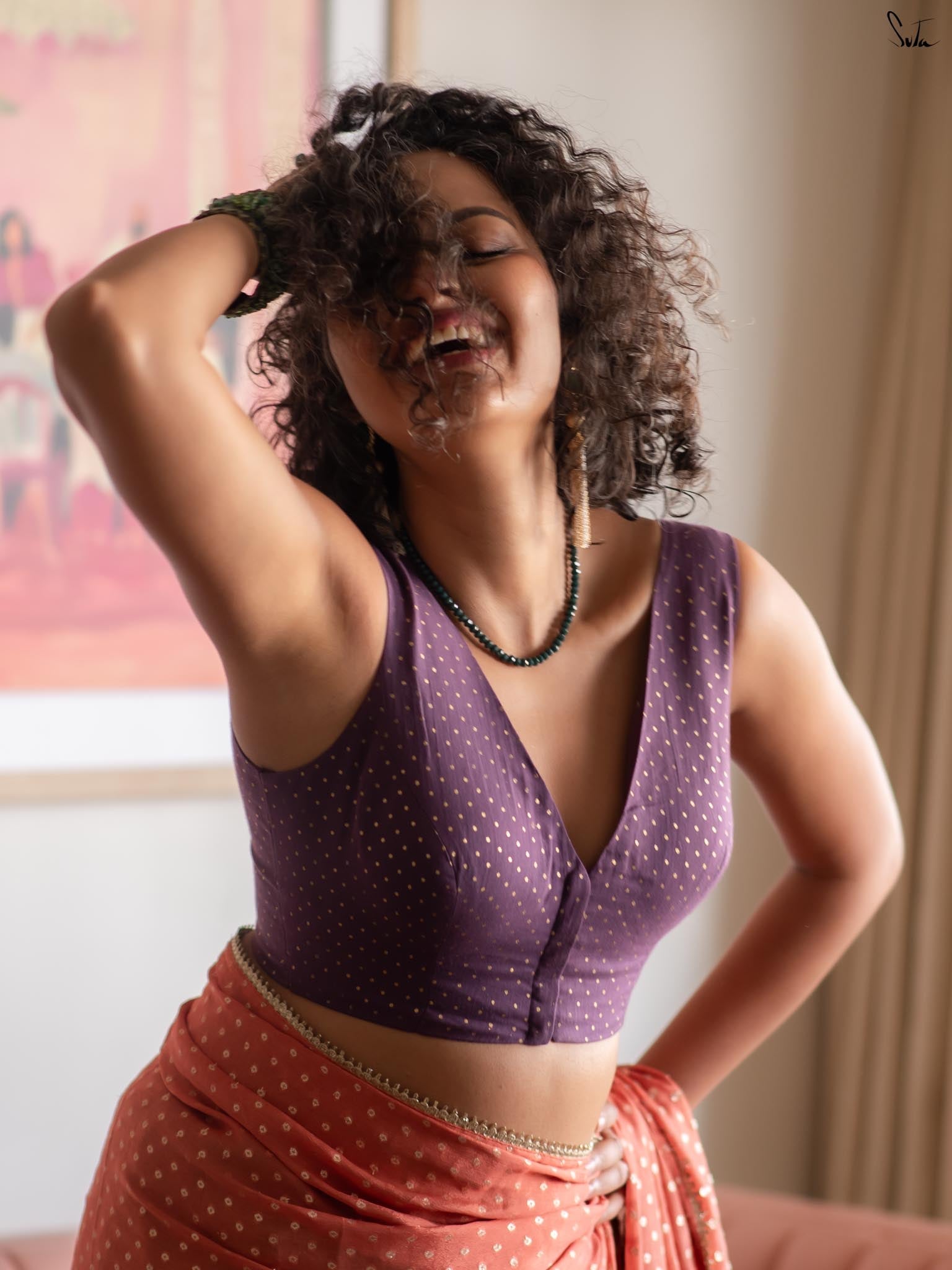 This purple cotton viscose blouse is designed with a graceful sleeveless silhouette and a flattering V-neckline. Scattered with delicate gold polka foil prints, it carries a playful shimmer that catches the light beautifully. The padded structure offers comfort and shape, while the front opening adds ease and functionality to the design.