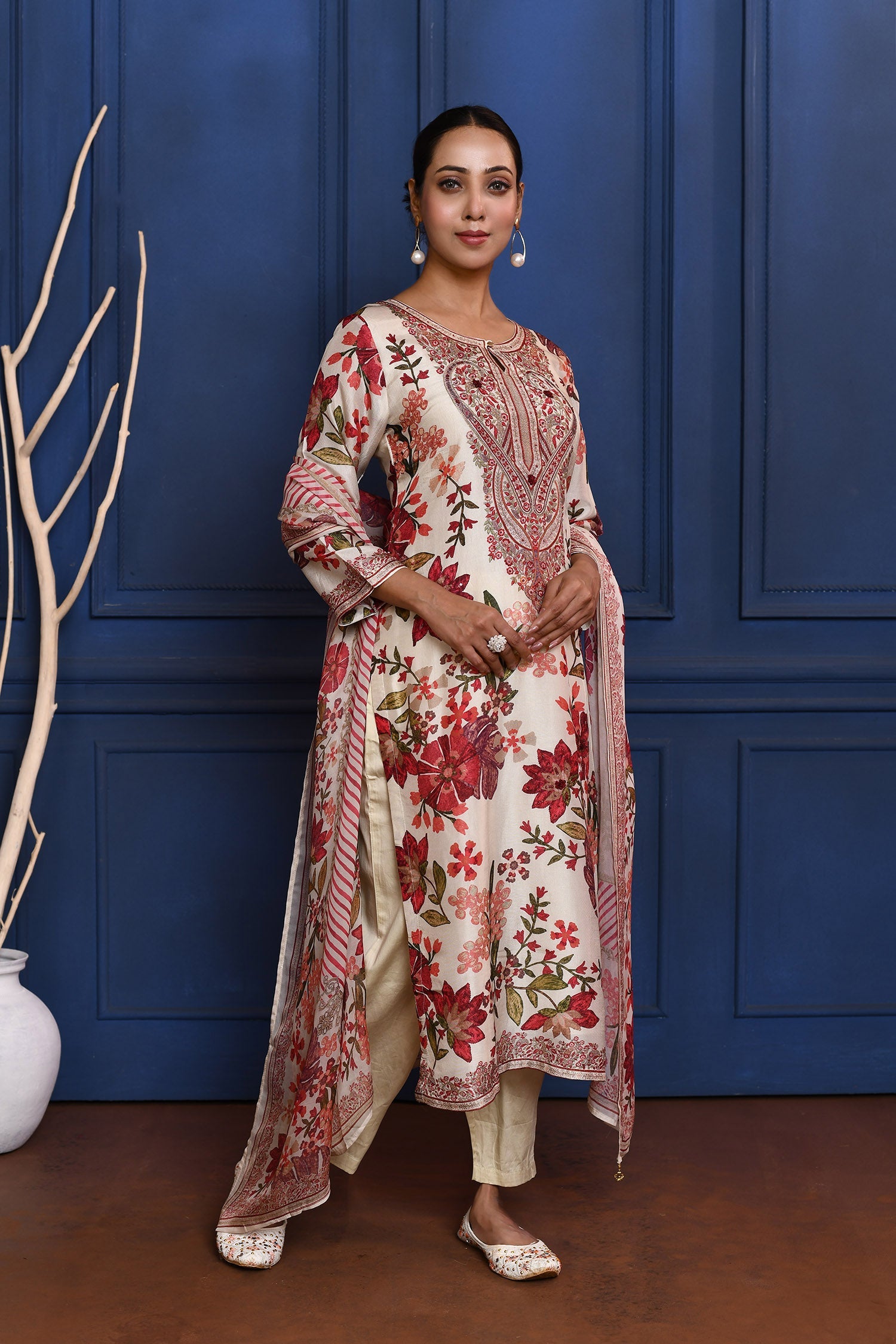 The white floral printed crepe silk straight cut kurta set with matching printed dupatta and plain straight pant for a ethnic look with simple charm.