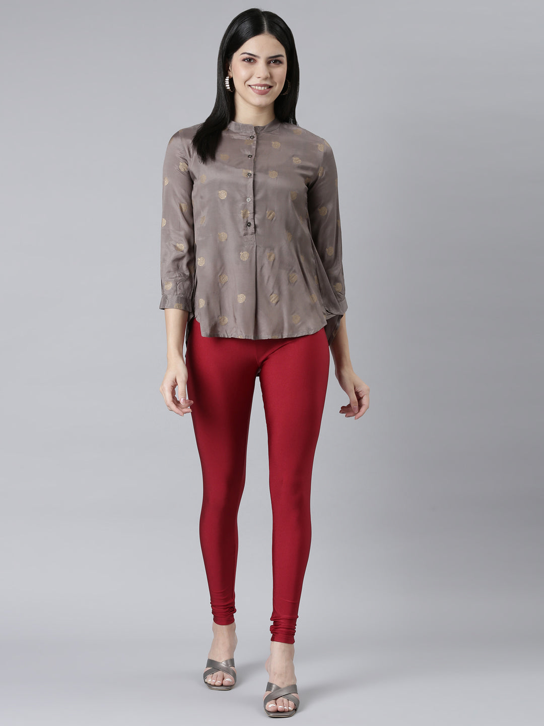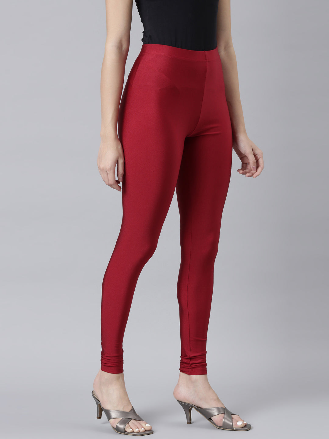 Go chic with a pair of Dark Red Solid Shimmer Churidar Leggings. Made from high quality Nylon & Elastane, it has a elasticised waistband & gathers at the hemline.