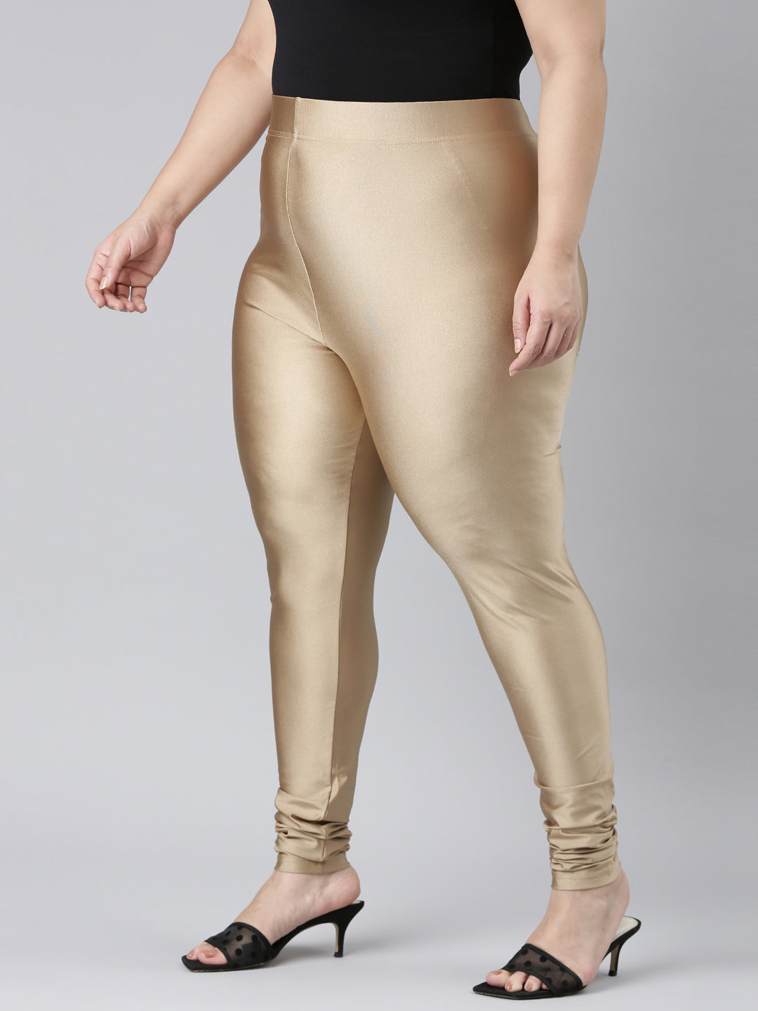 Go chic with a pair of Deep Gold Solid Shimmer Churidar Leggings. Made from high quality Nylon & Elastane, it has a elasticised waistband & gathers at the hemline.