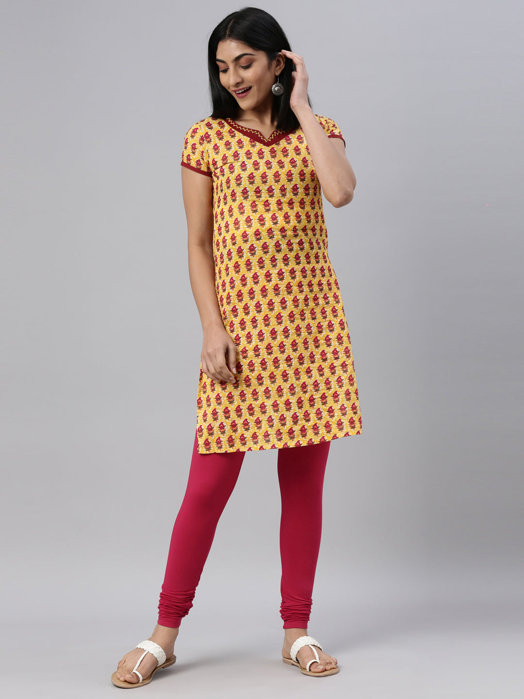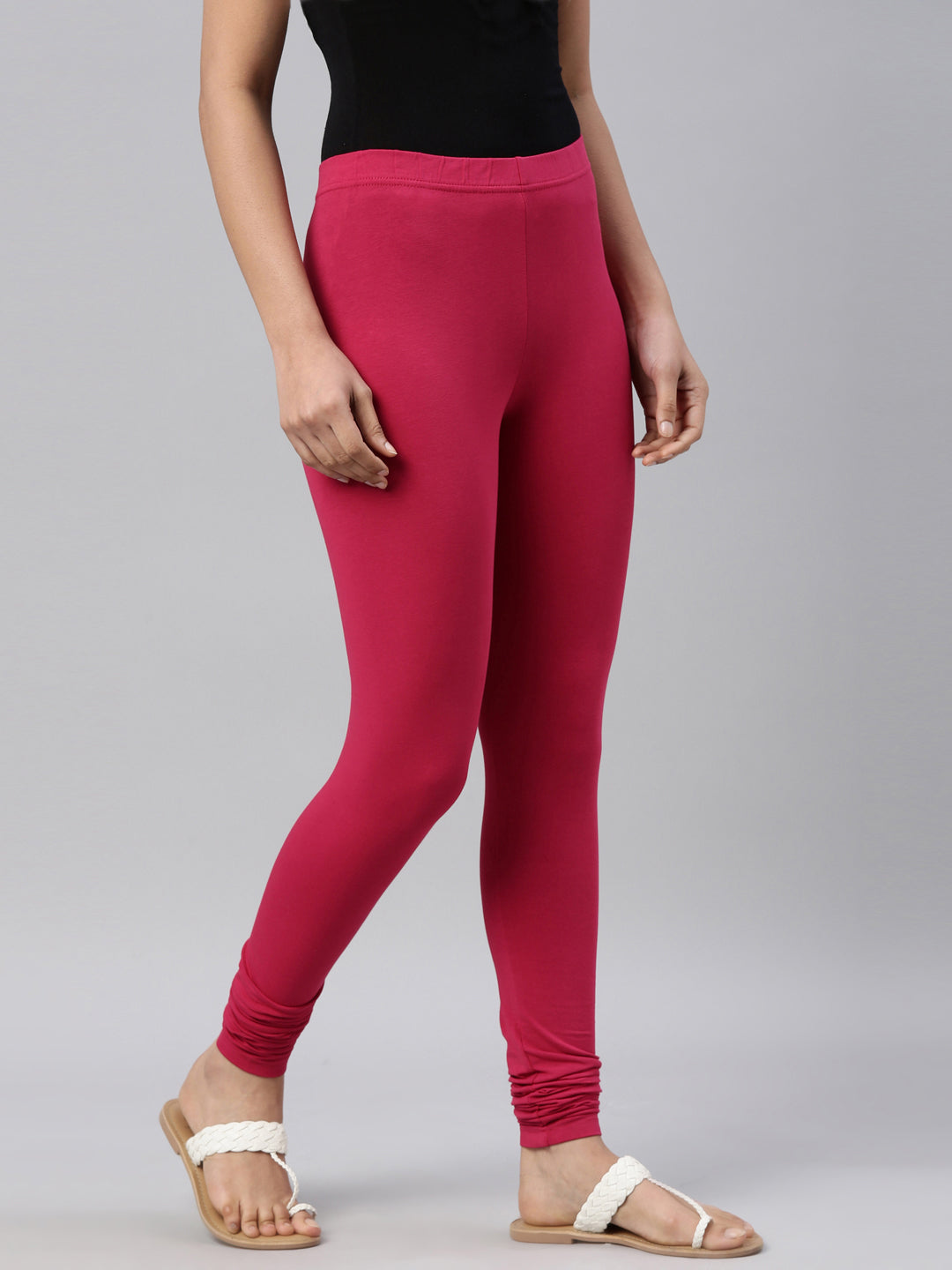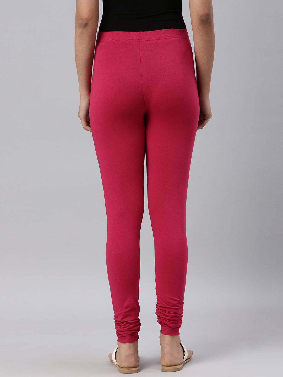 Go chic with a pair of Fuchsia Solid Churidar Leggings. Made from high quality cotton, it has a elasticised waistband & gathers at the hemline.