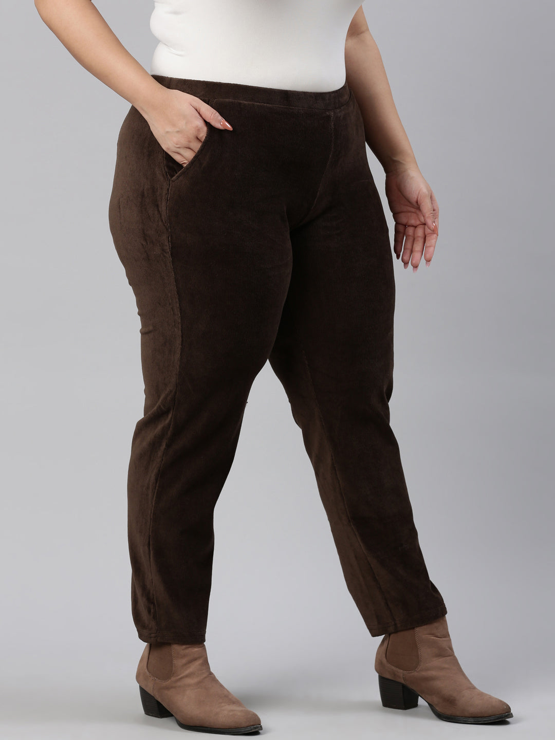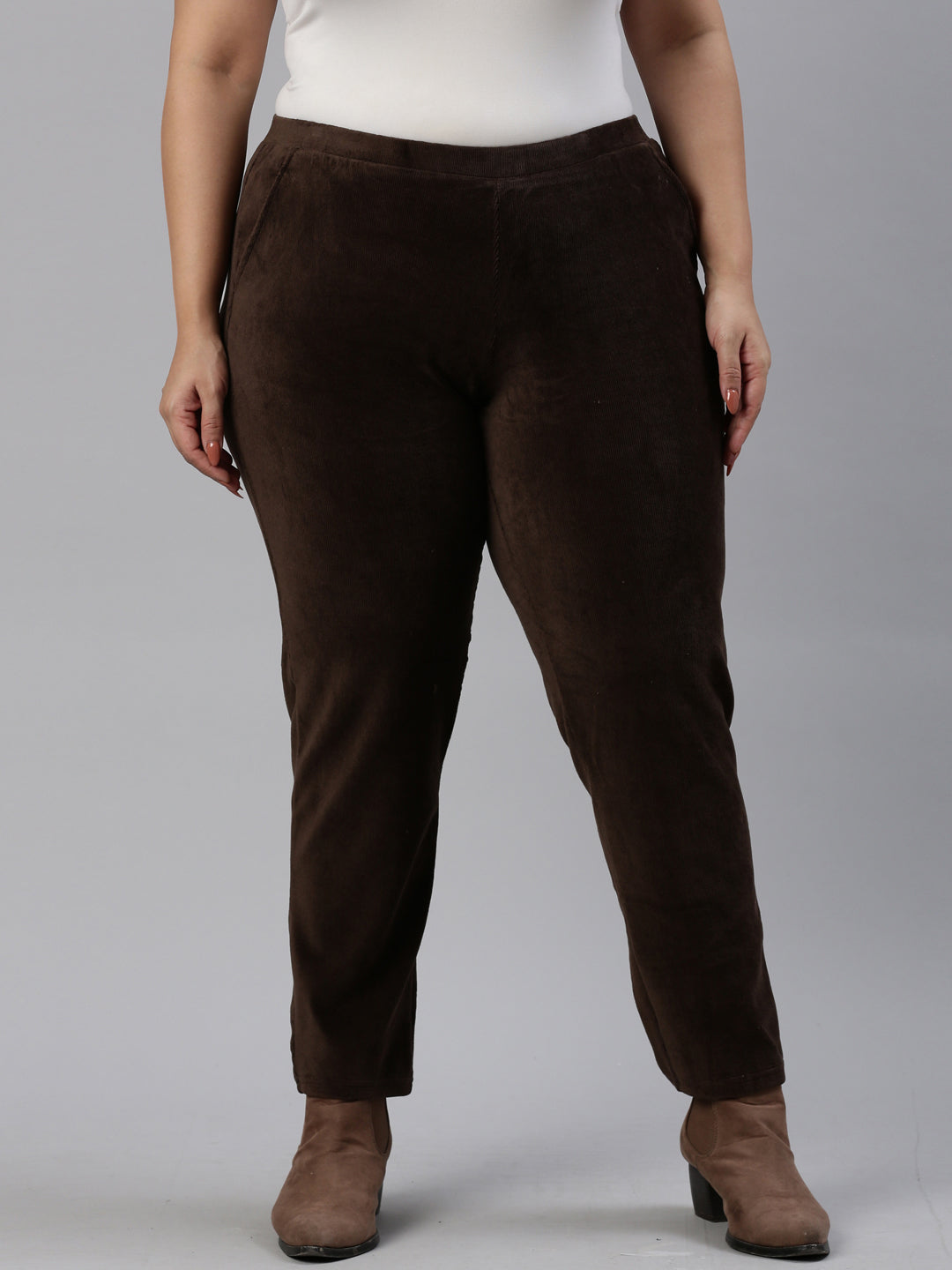 Bundle up in freezing temparatures in the Solid Dark Brown Corduroy Jeggings. Made from cotton, polyester & PU, the slip on trousers have a elasticised waistband, slant pockets & a tapered fit.